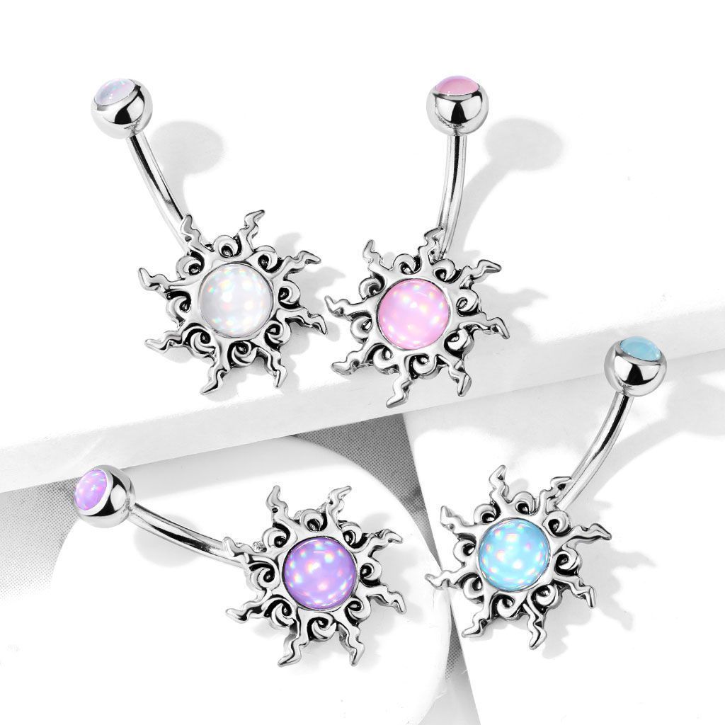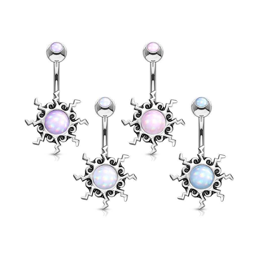 Piercingový šperk určený pro piercing pupíku. Piercing do pupíku zdobený ozdobou v tribal tvaru.