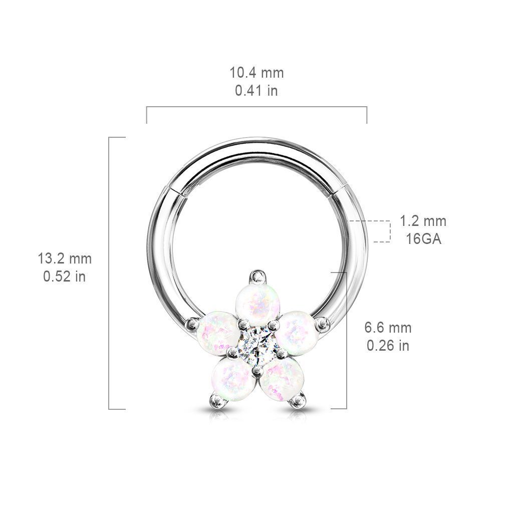 Piercing segment kruh rozevírací zdobený kytičkou se zirkonem a glitrovými korálky.