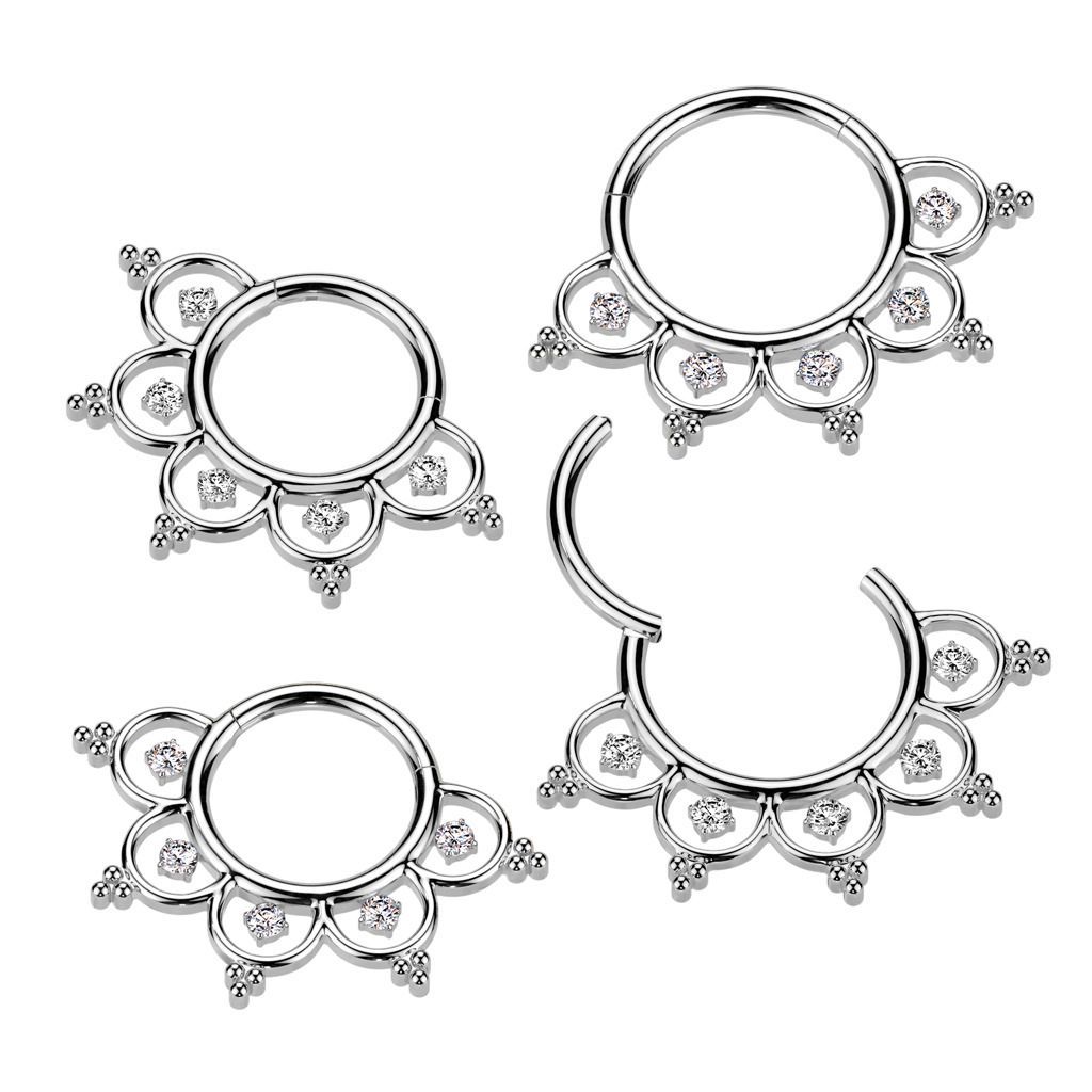 Ozdobný titanový segment kruh s praktickým zapínáním na pantík. Piercing vhodný do ucha nebo nosu (septum). Piercing je zdobený zajímavým vzorem doplněným droboučkými kuličkami a čirými zirkony.