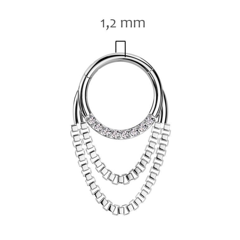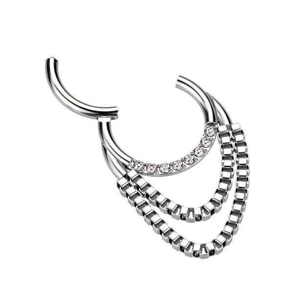Piercing má praktické otevírání na pantík. Je zdoben zirkony a zavěšenými řetízky.