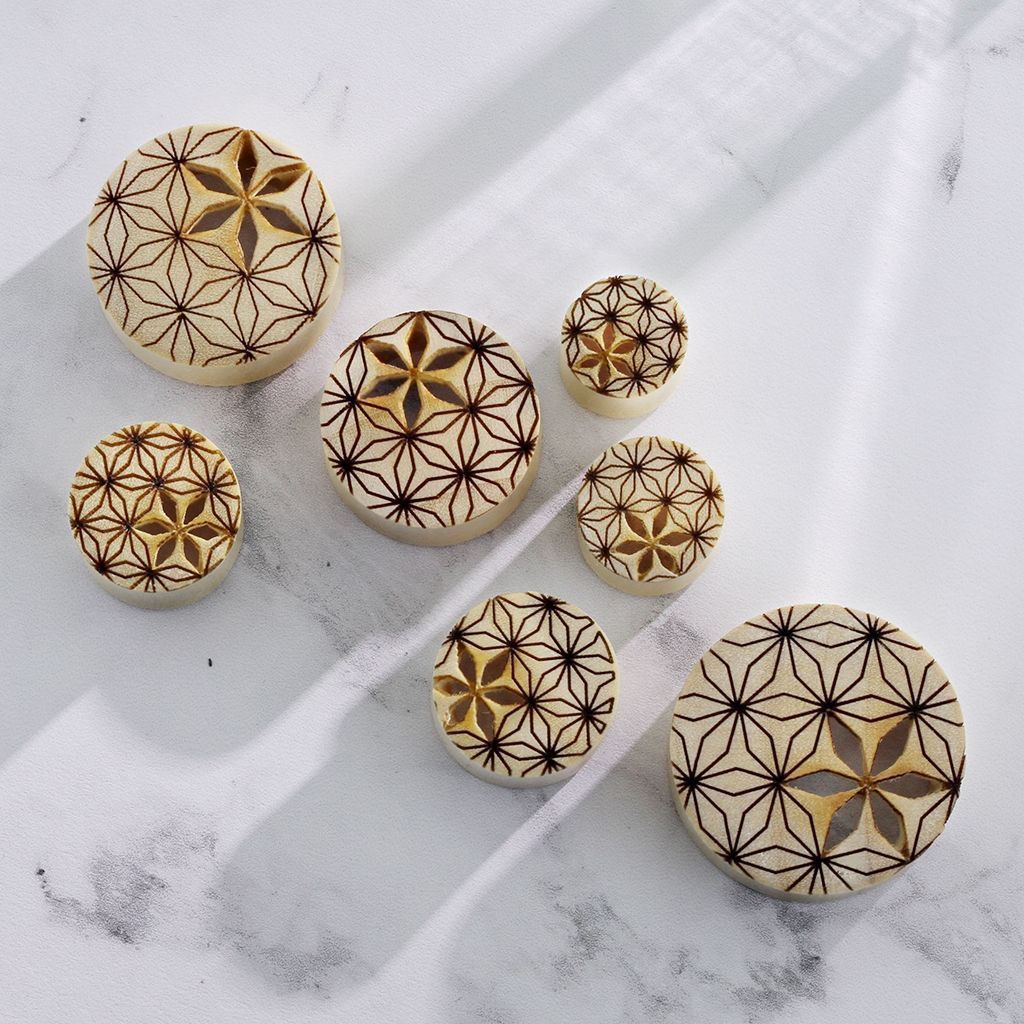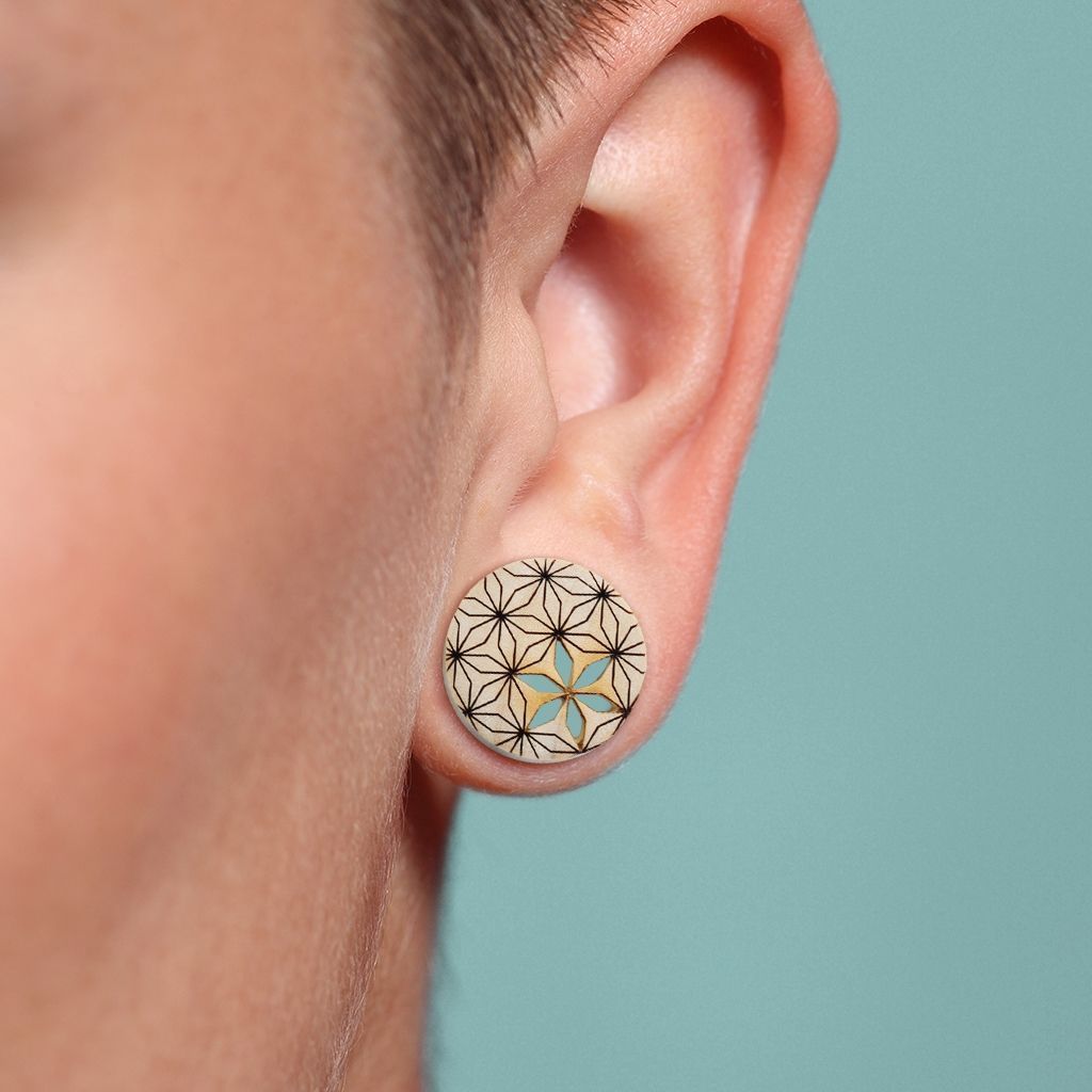 Organický plug do ucha z tropického dřeva stromu Crocodile wood zdobný geometrickým motivem s výřezem.