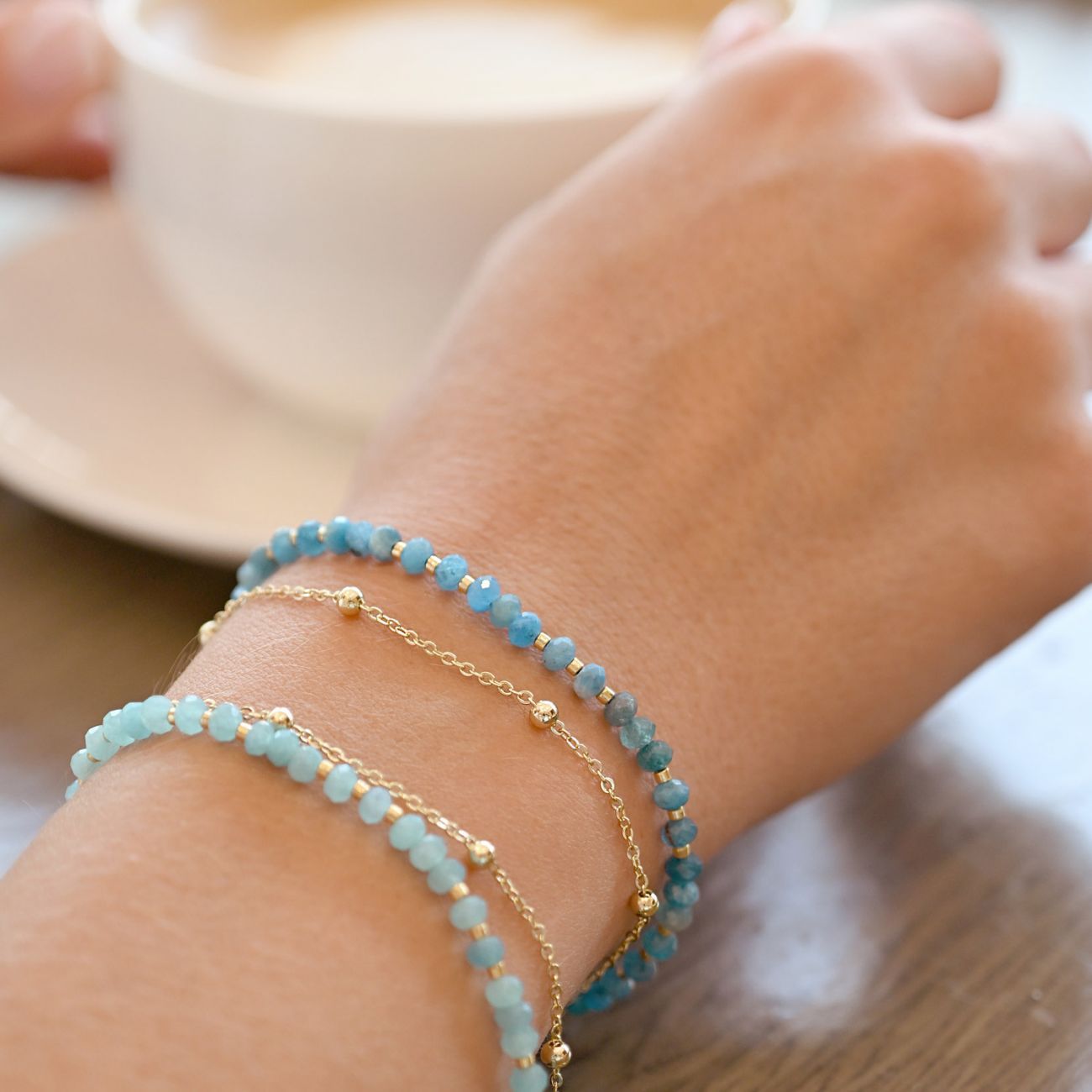 Tento rafinovaný dvojitý náramek kombinuje zlatavý řetízek z pozlaceného stříbra s korálky z pravých amazonitů v jemně tyrkysové barvě. Kontrast teplého zlata a chladivých tónů minerálu vytváří moderní, harmonický a velmi svěží design.