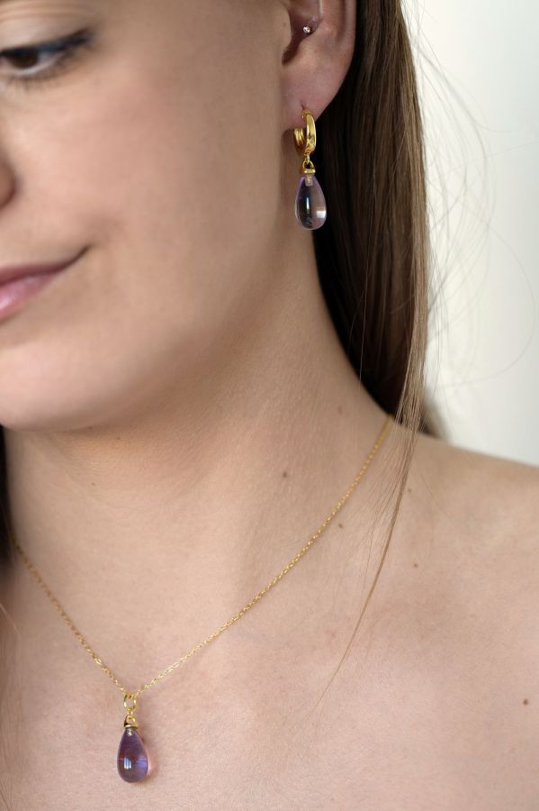 Náhrdelník s přívěskem je mistrovským skvostem, který dokonale spojuje čistou eleganci stříbra ryzosti 925/1000 s jemným zlatým nádechem a okouzlující krásou vzácného přírodního ametystu. Luxusní přívěsek ve tvaru protáhlé kapky vás okamžitě vtáhne do magického světa tajemství, vnitřní síly a nespoutané ženskosti. Každý detail tohoto šperku je promyšlen tak, aby vyprávěl příběh výjimečnosti a krásy.