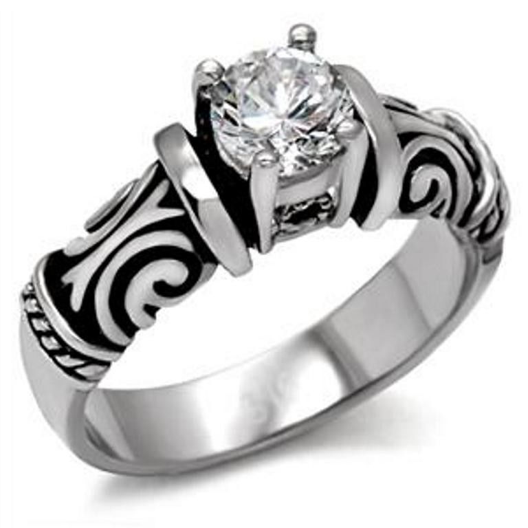 Prsten z lesklé chirurgické oceli. Zdobený čirým zirkonem. V designu tepaného starostříbra.