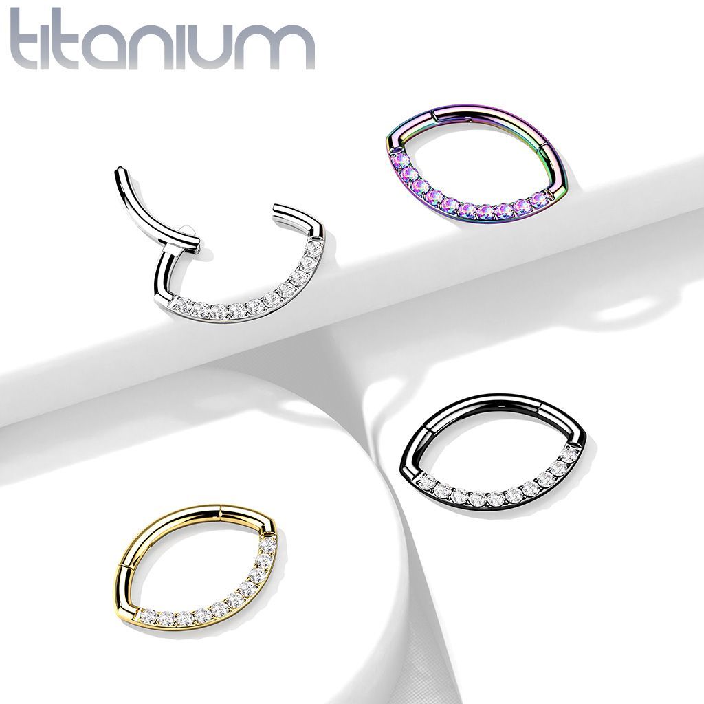 Piercingový segment kruh zdobený čirými zirkony. Piercing je vhodný do ucha či septa. Piercing má praktické rozevírání.