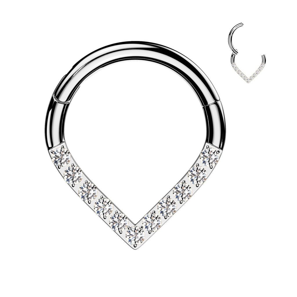 Piercing má praktické otevírání na pantík. Je zdoben tvarováním do V s řadou čirých zirkonů.