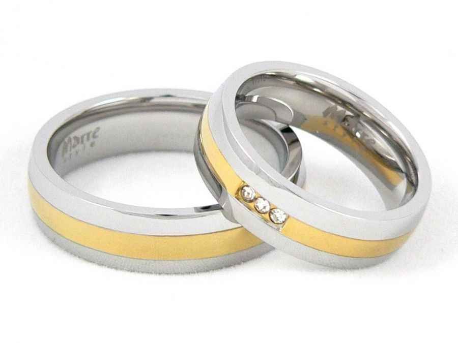 Snubní prsteny z lesklé chirurgické oceli, zdobené zlacením, dámský prsten je navíc osazen čirými zirkony.
