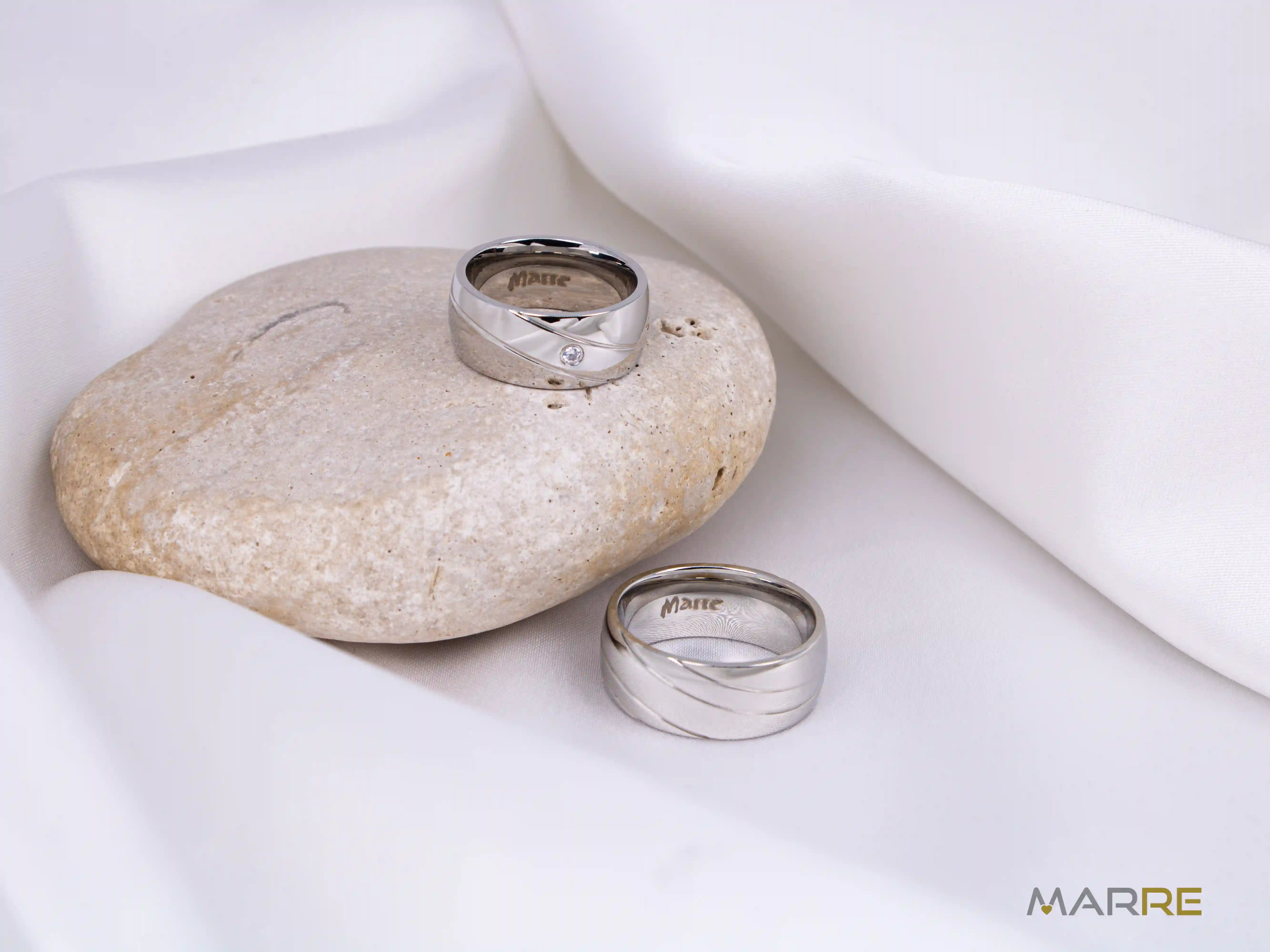 Snubní prsteny z chirurgické oceli. Lesklá chirurgická ocel. Dámský prsten je navíc osazen čirým zirkonem.