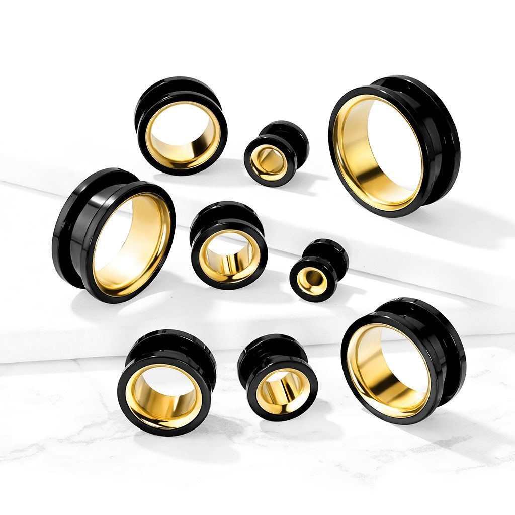 Černý šroubovací tunel do ucha se zlacenou dekorativní výplní.