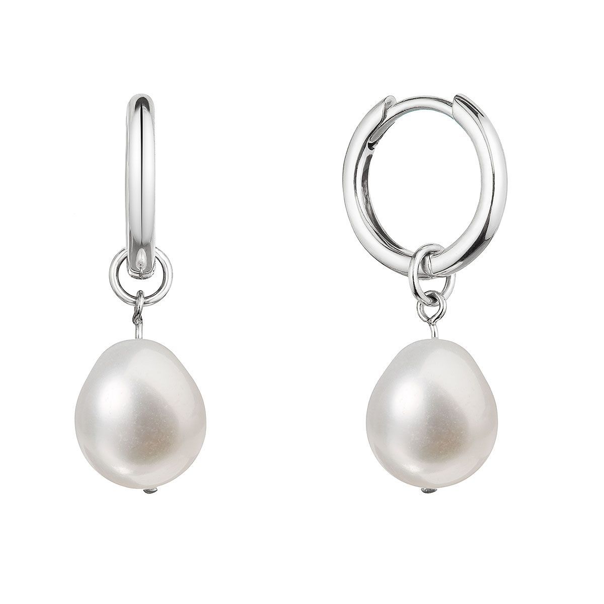 Stříbrné náušnice kruhy s visací bílou říční perlou baroko 21106.1