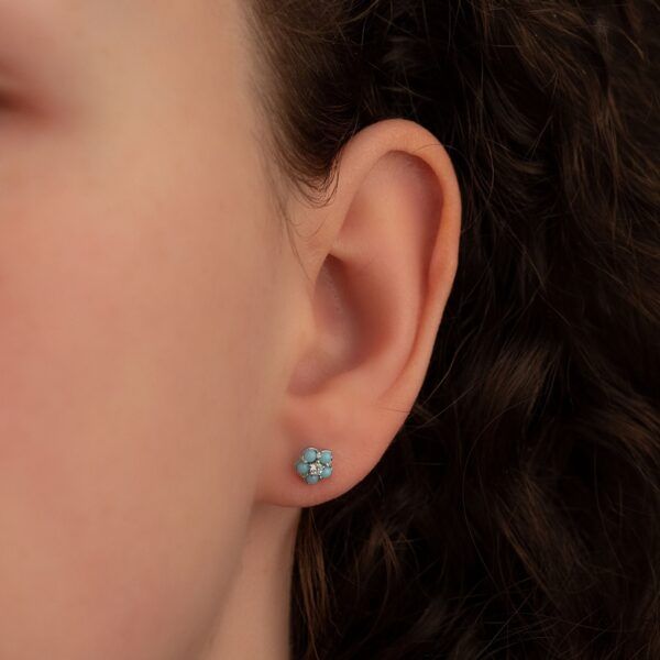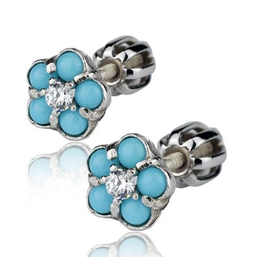 Stříbrné puzetové náušnice se šroubovacím uzávěrem. Tyrkysové kytičky uprostřed zdobené čirým zirkonem.
