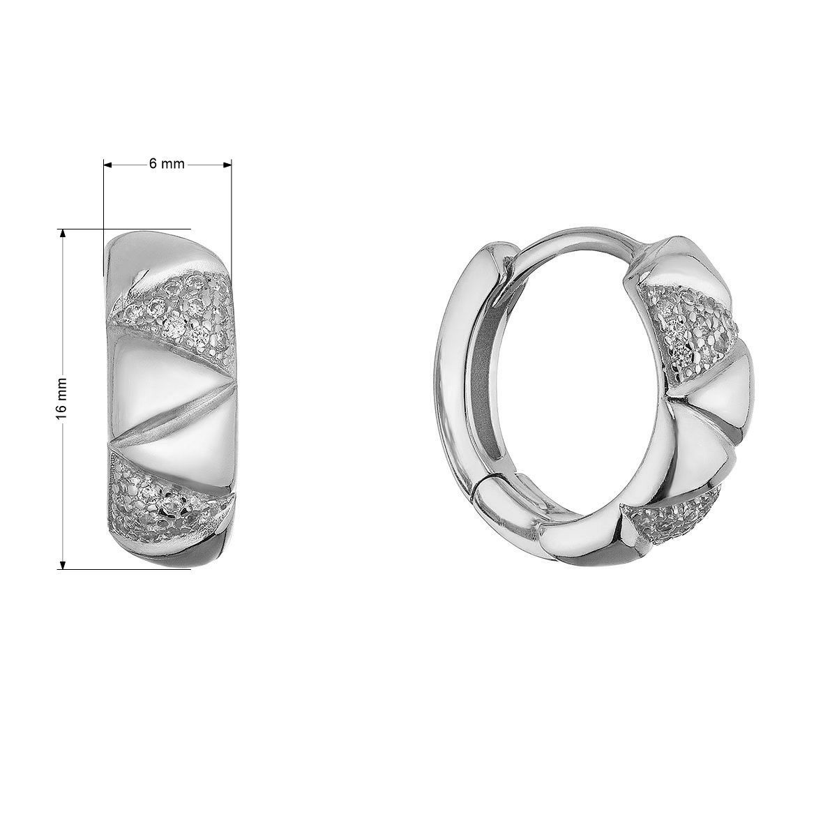 Náušnice jsou vyrobeny ze stříbra ryzosti 925/1000, jehož povrch je ošetřen vrstvou rhodia. Rhodium šperk chrání proti zčernání a zajistí jeho dlouhotrvající lesk. Přední část kruhů je ozdobena třpytivými zirkony. Zapínání náušnic na spolehlivý kroužek.