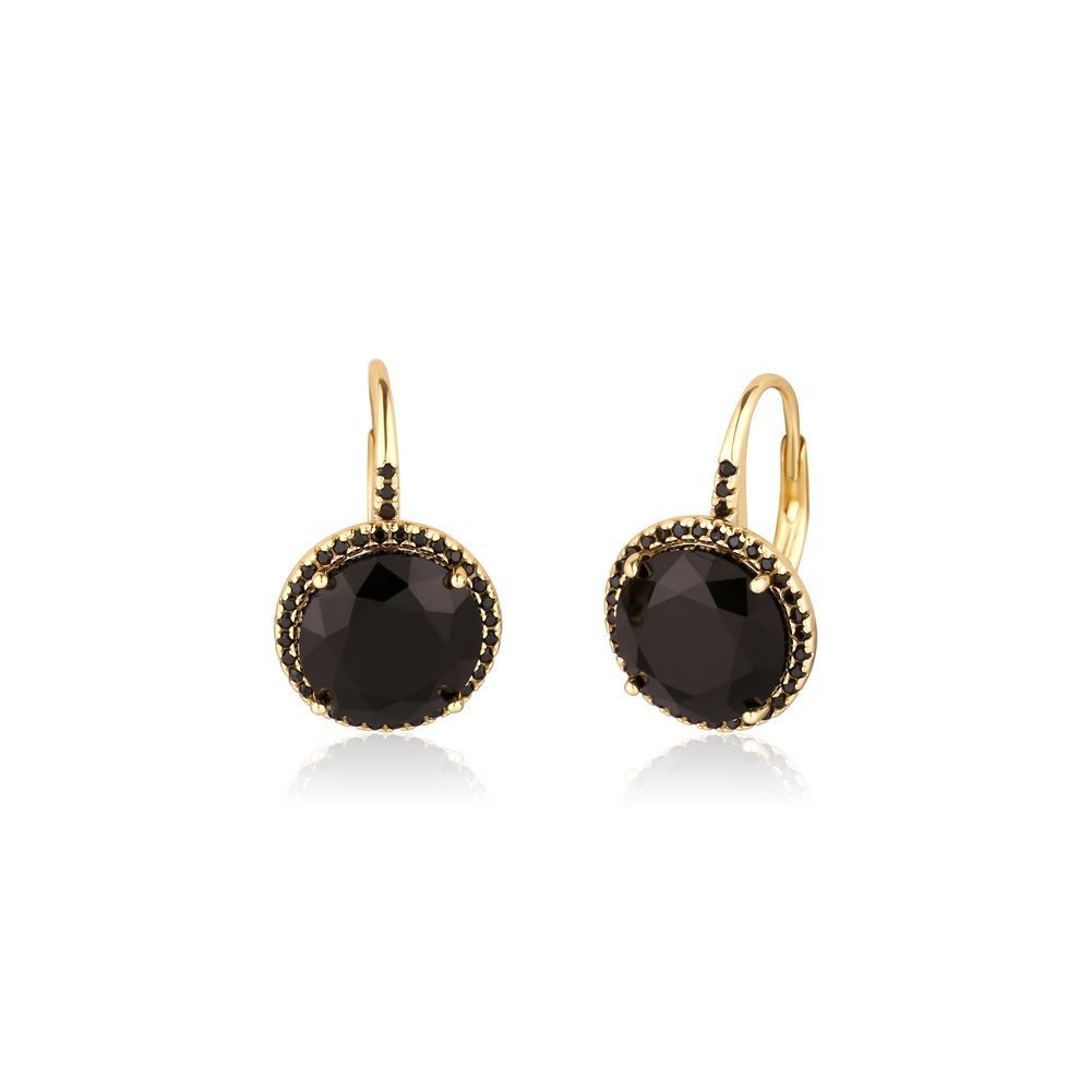 Stříbrné zlacené náušnice velmi bohatě zdobené černými zirkony. Náušnice mají zapínání na klapku.