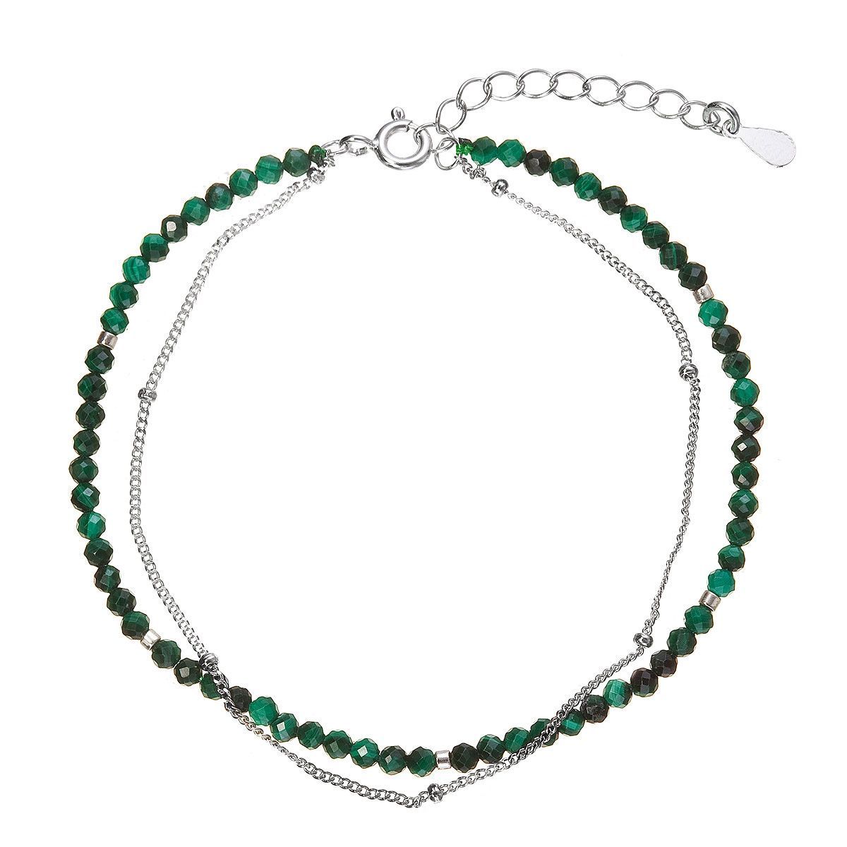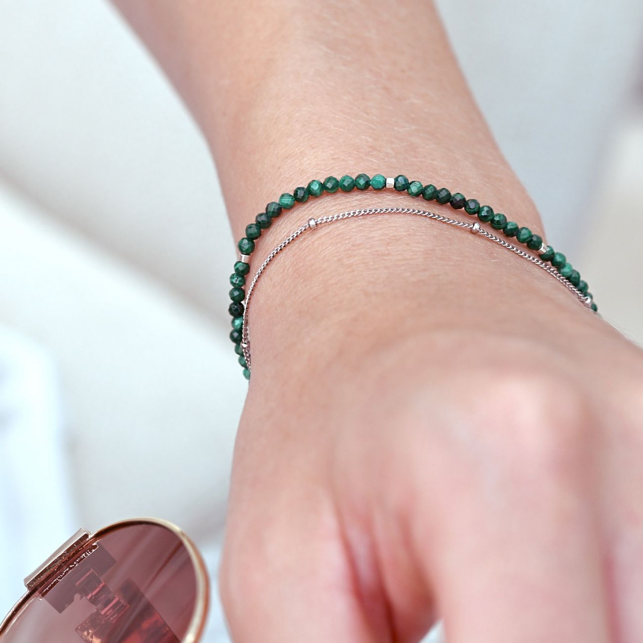 Tento elegantní dvojitý náramek kombinuje jemný stříbrný řetízek s linií drobných broušených korálků ze zeleného malachitu. Sytě zelené tóny malachitu krásně vynikají vedle chladivého lesku stříbra. Náramek je vyroben ze stříbra ryzosti 925/1000 s rhodiovou povrchovou úpravou, která zajišťuje dlouhotrvající lesk a ochranu proti zčernání. Díky zapínání na karabinku a adjustě lze jeho délku upravit z 17 cm o další 4 cm. Jemný, moderní a přitom výrazný šperk pro každý den.