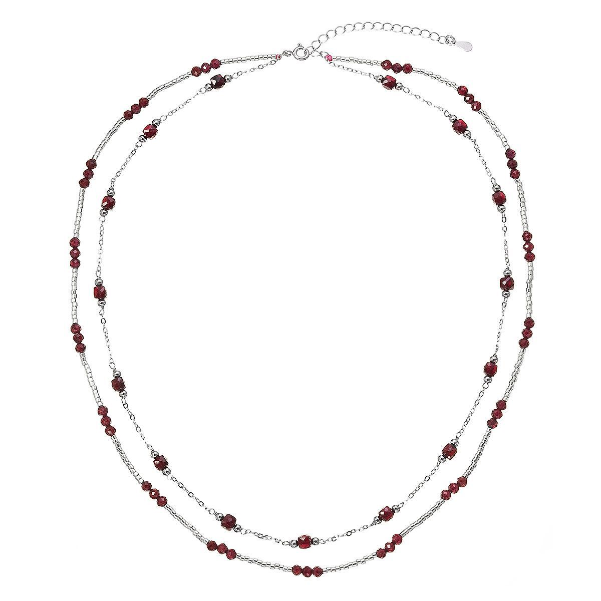 Okouzlující jemný dvouřadý náhrdelník s drobnými přírodními kamínky granáty působí lehce a elegantně.