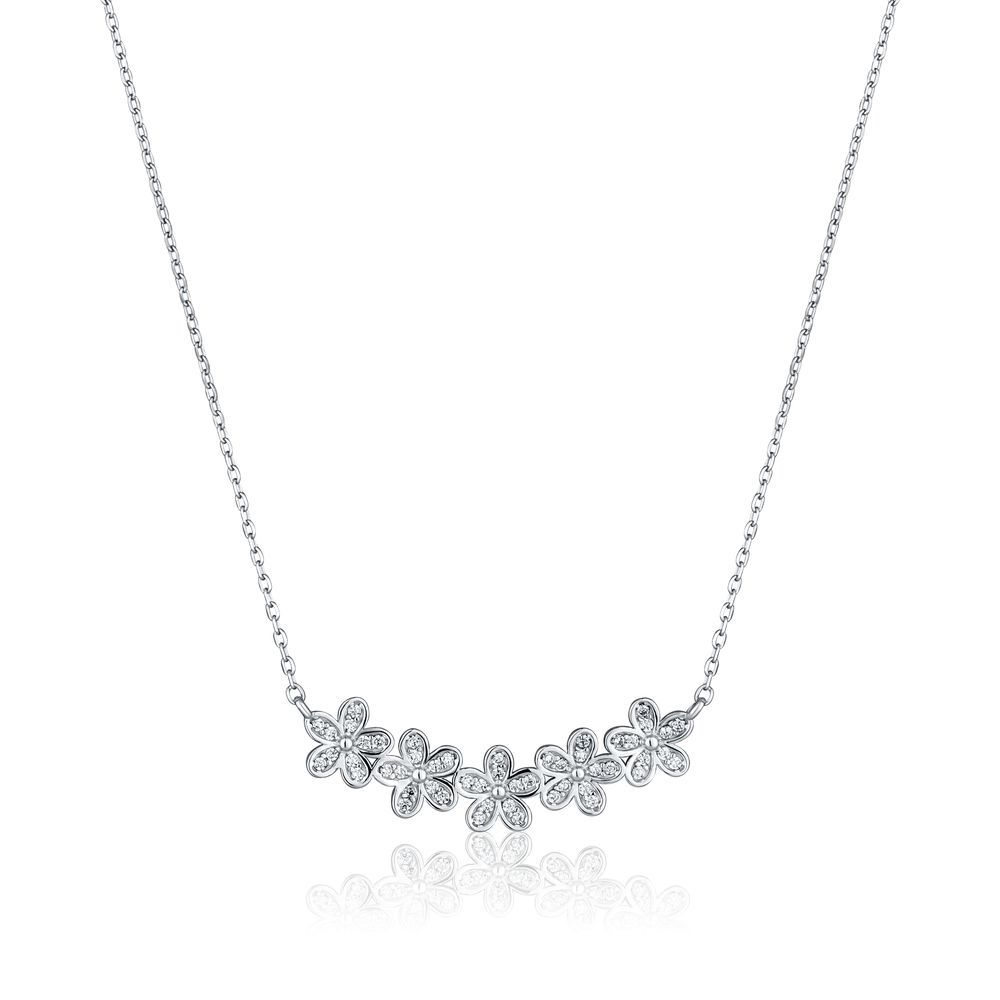 Stříbrný náhrdelník - jemný stříbrný očkový řetízek s květinkami s čirými zirkony.