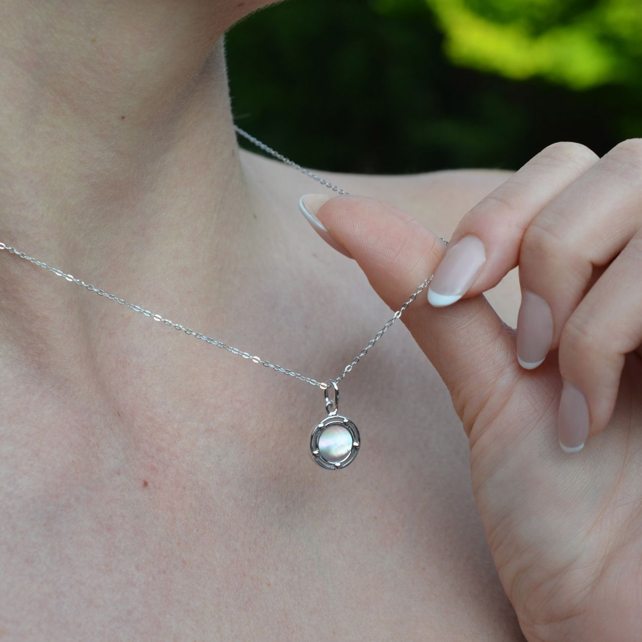 Náhrdelník s přívěskem je vytvořen ze stříbra ryzosti 925/1000 s rhodiovou úpravou, která poskytuje šperku maximální ochranu před poškrábáním, zežloutnutím i zčernáním. Precizně zasazená jemně růžová perleť je něžně obemknuta pozlaceným stříbrem, čímž vytváří dokonalou harmonii barev a tvarů. Kulatý přívěsek s perletí zachycuje proměnlivost světla - při každém pohybu hraje jemnými barvami, které okouzlují svou křehkou krásou.