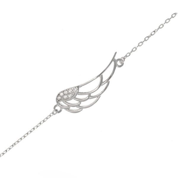 Jemný stříbrný očkový náramek zdobený andělským křídlem, které je z části osázeno čirými zirkony.