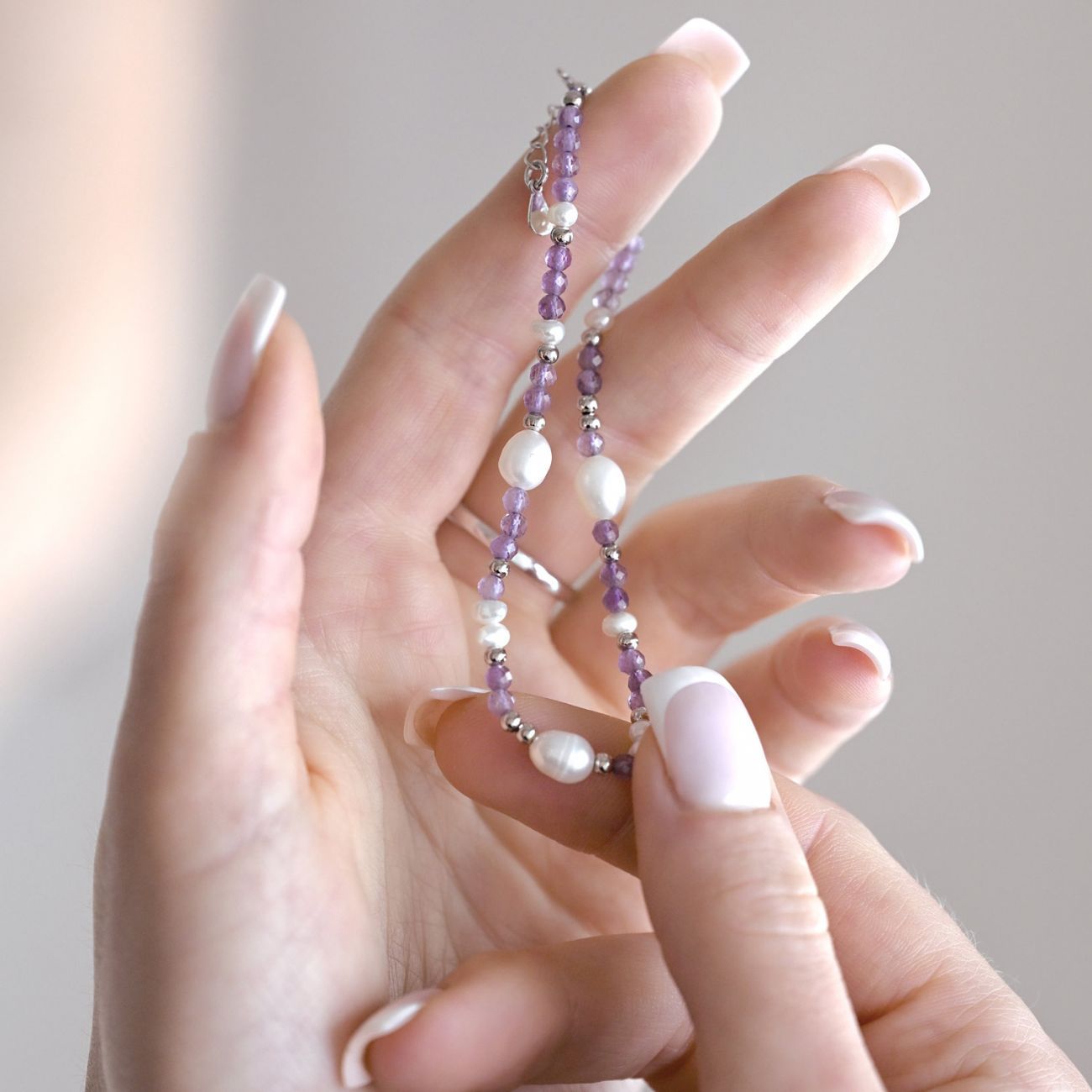 Tento elegantní náramek je tvořen kombinací pravých ametystů v jemně fialové barvě a pravých říčních perel různých tvarů, které dohromady vytvářejí harmonický a ženský celek. Drobné broušené ametysty se krásně lesknou a dokonale ladí s přirozeným perleťovým třpytem perel.