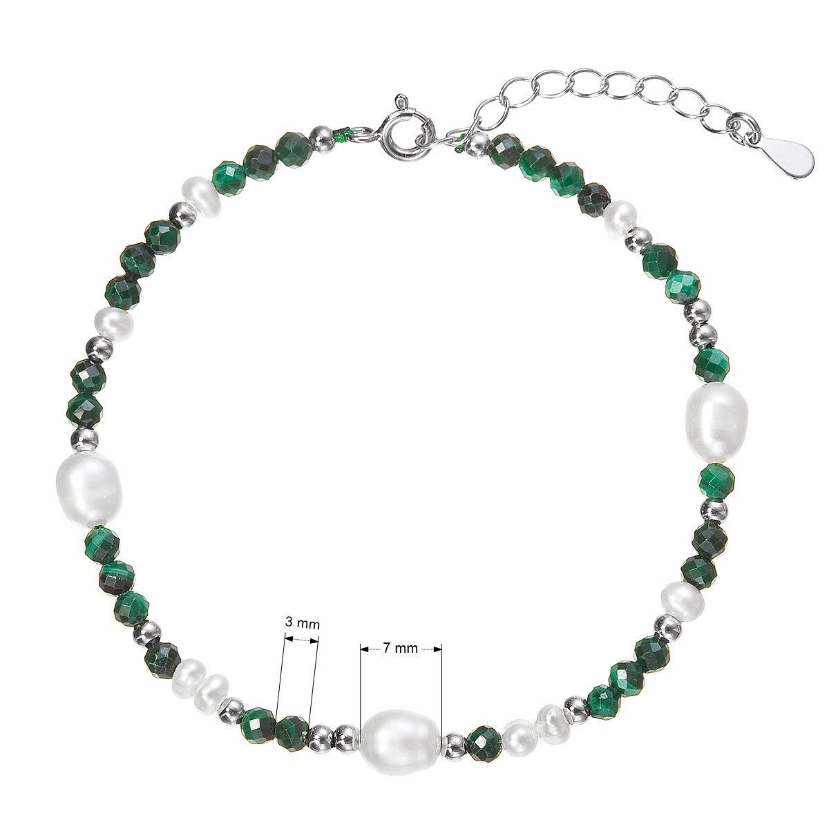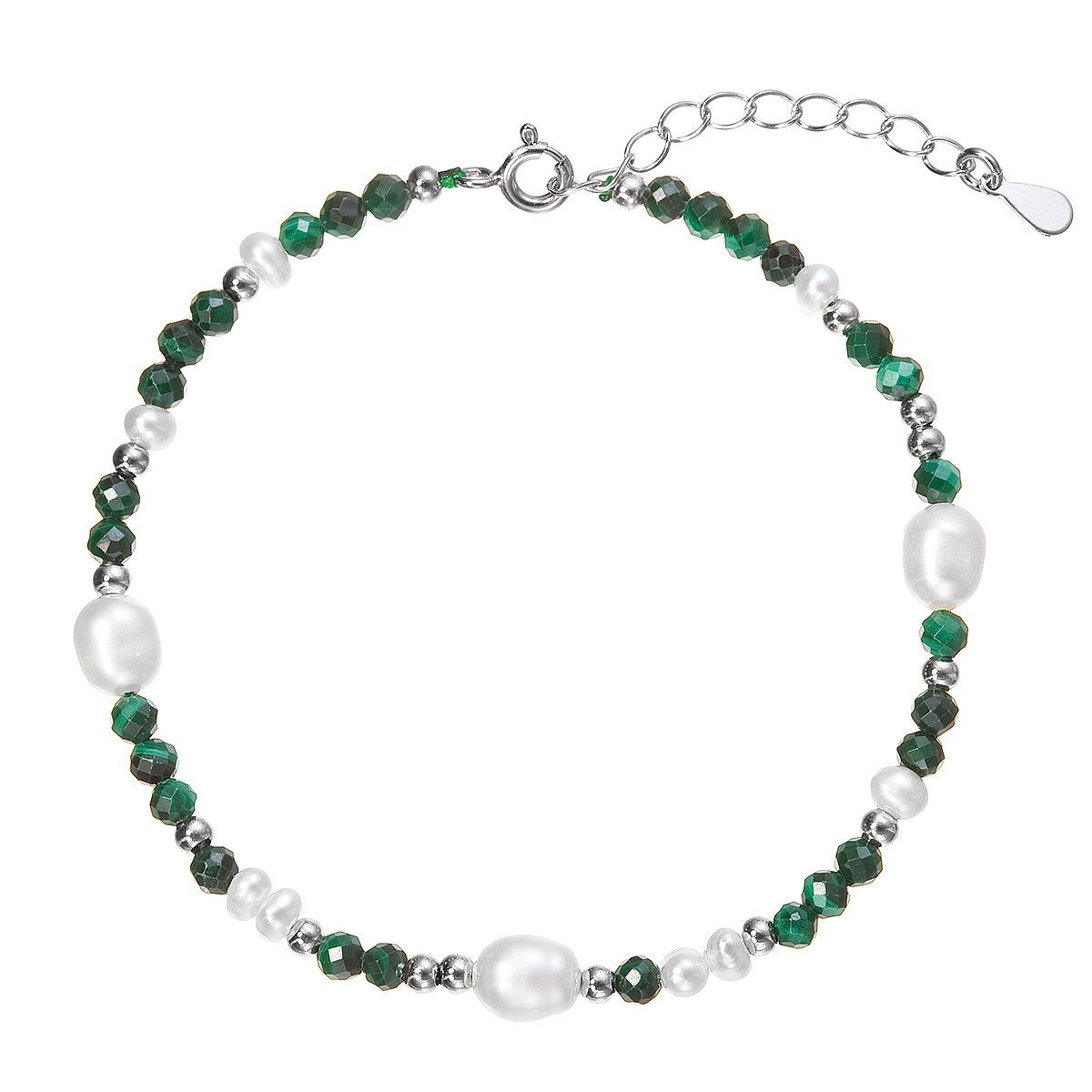 Tento elegantní náramek je tvořen pravými říčními perlami různých tvarů a drobnými korálky malachitu v sytě zelené barvě. Jemný perleťový lesk perel se nádherně doplňuje s výraznou zelení malachitu, která šperku dodává svěžest, přírodní energii a jedinečný charakter.