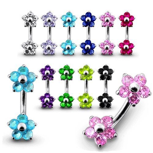 Piercingový šperk určený pro piercing pupíku. Piercing je zdobený ozdobami ve tvaru kytiček.