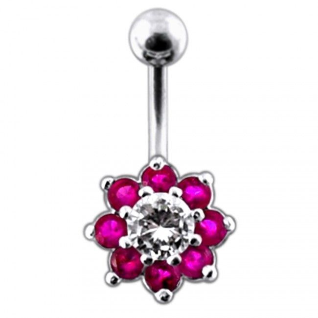 Piercingový šperk určený pro piercing pupíku. Piercing je zdobený ozdobou ve tvaru kytičky.