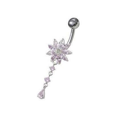 Piercingový šperk určený pro piercing pupíku. Piercing s kytičkou a dlouhou ozdobou zdobenou zirkony.