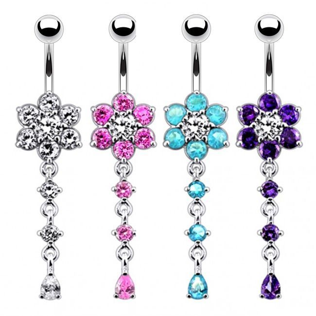 Piercingový šperk určený pro piercing pupíku. Piercing je zdobený kytičkou osazenou zirkony.