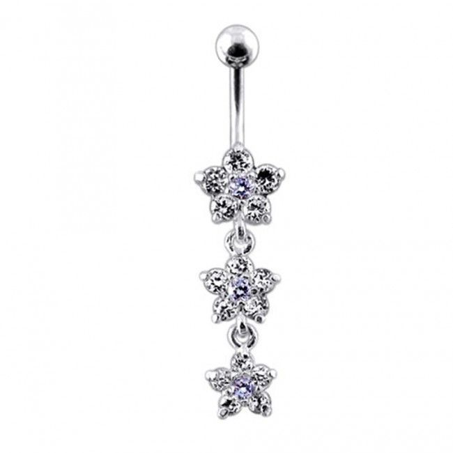 Piercingový šperk určený pro piercing pupíku. Piercing je zdobený kytičkami osázenými zirkony.