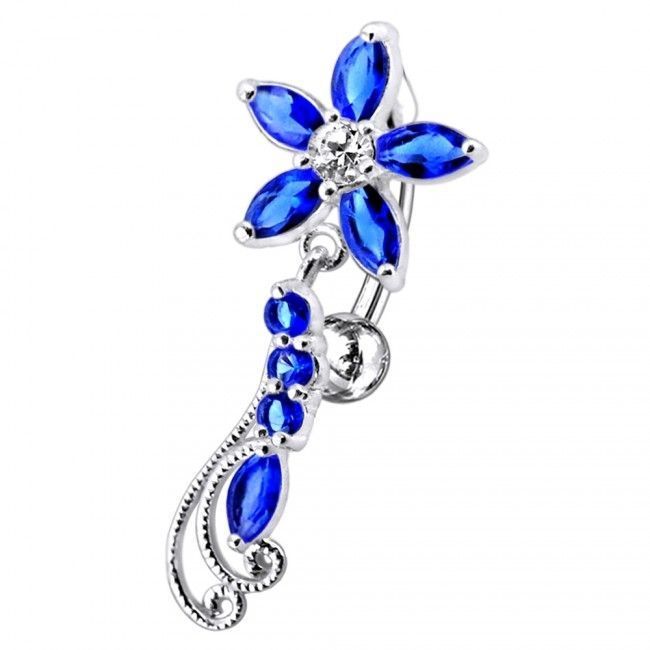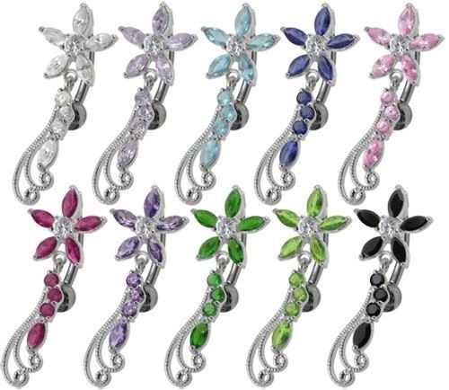 Piercingový šperk určený pro piercing pupíku. Piercing s kytičkou a dlouhou ozdobou se zirkony.