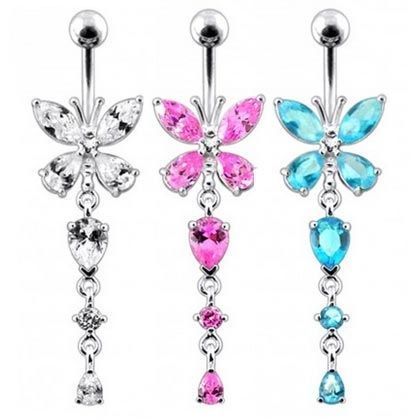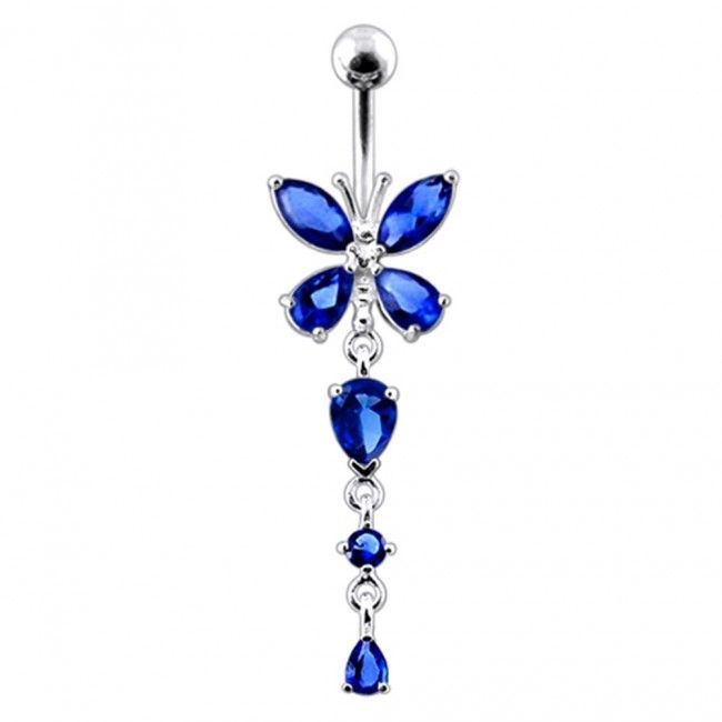 Piercingový šperk určený pro piercing pupíku. Piercing je zdobený visací ozdobou - motýlkem se zirkony.