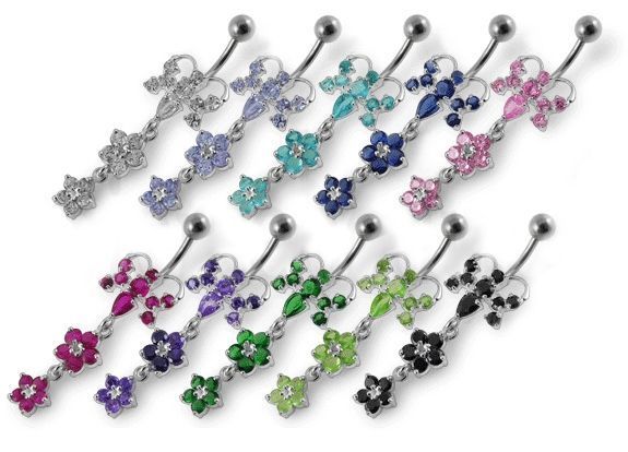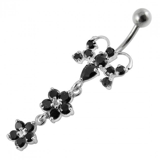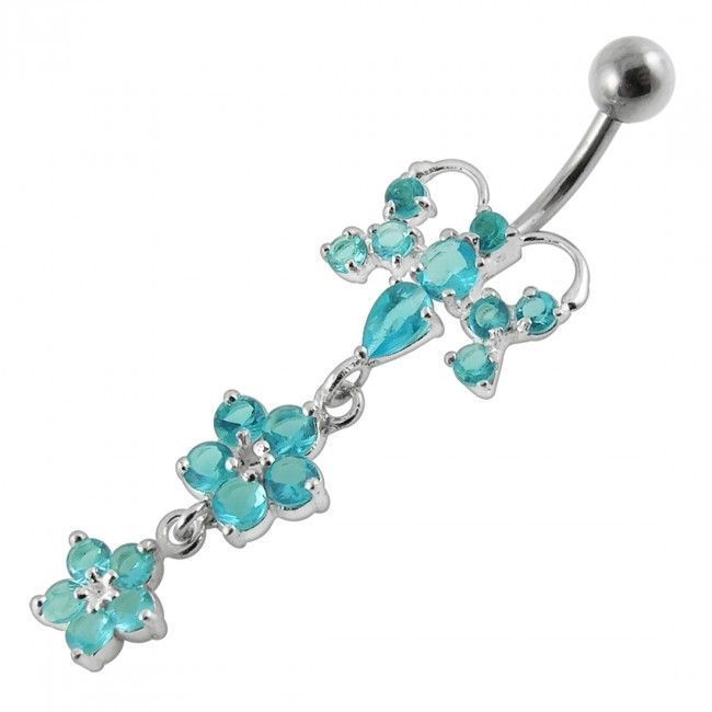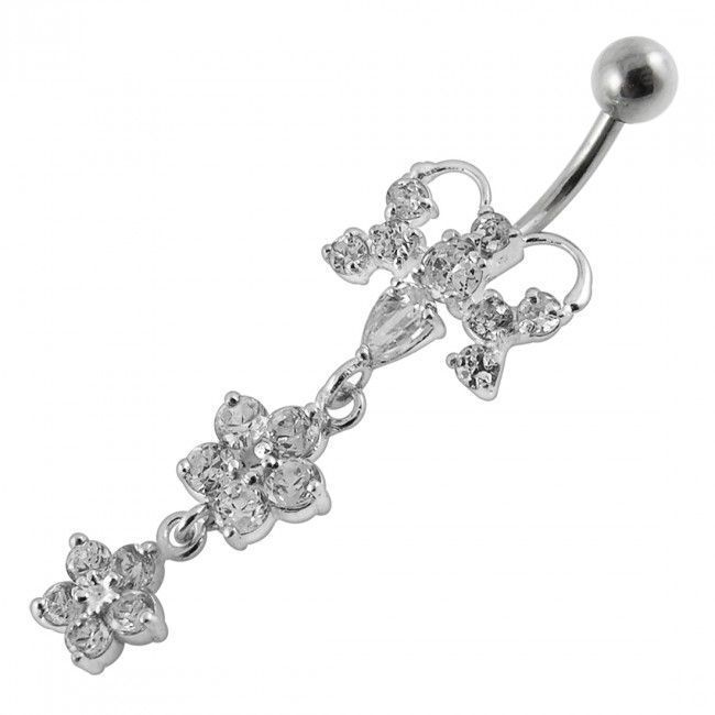 Piercingový šperk určený pro piercing pupíku. Piercing s motýlem a dlouhou ozdobou s kytičkami se zirkony.