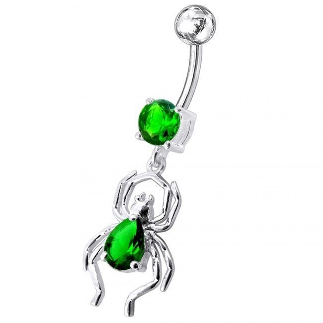 Piercingový šperk určený pro piercing pupíku. Piercing je zdobený ozdobou pavouka.