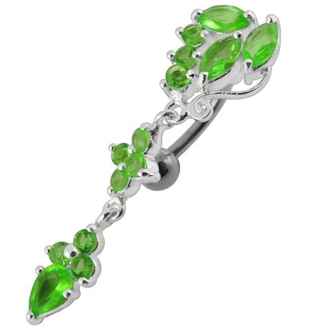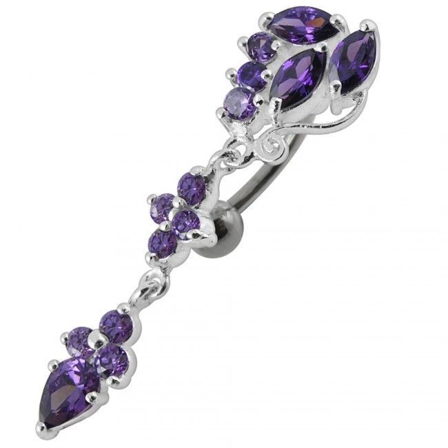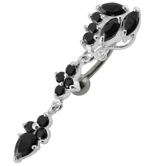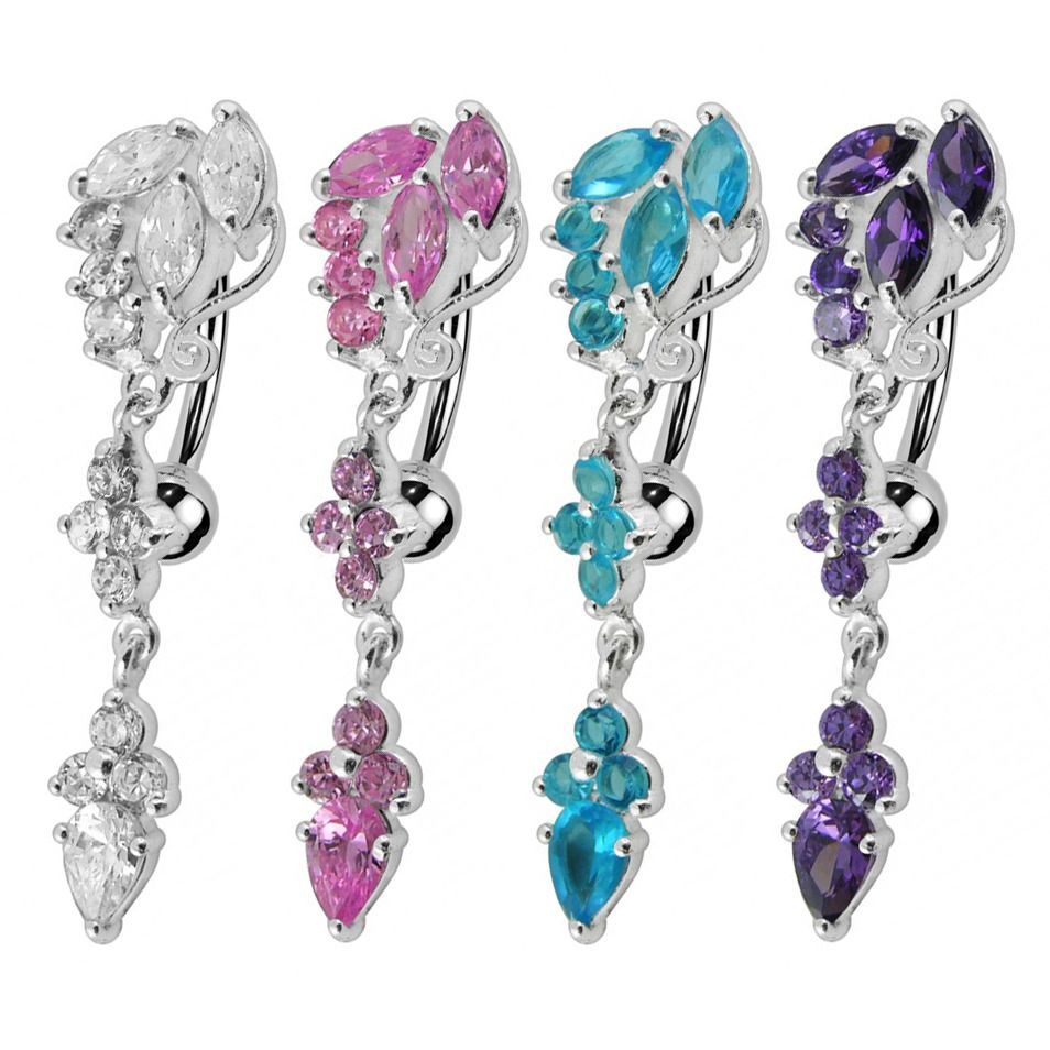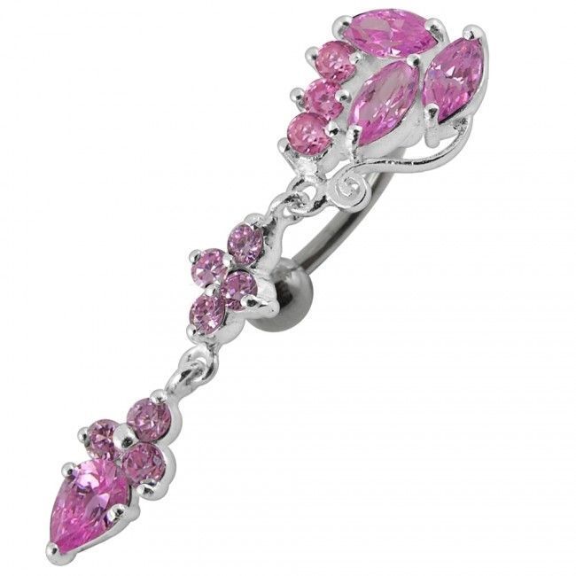 Piercingový šperk určený pro piercing pupíku. Piercing s dlouhou ozdobou zdobenou zirkony.