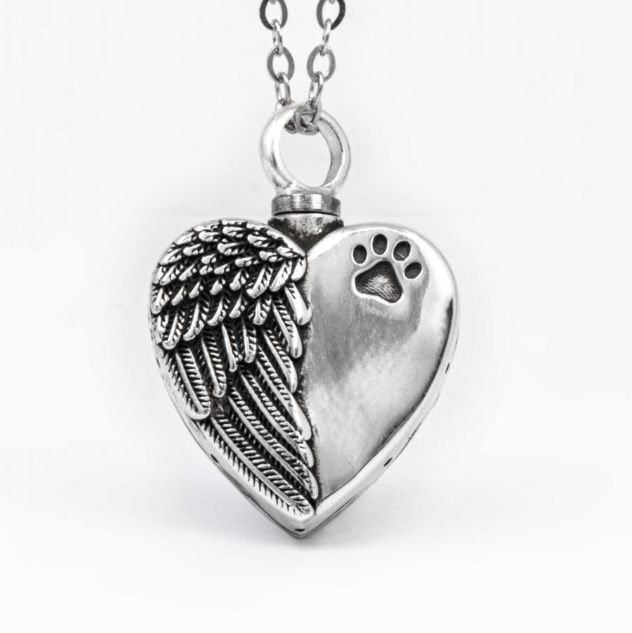 Tento pietní přívěsek ve tvaru srdce je určen pro ty, kteří si přejí uchovat vzpomínku na svého milovaného domácího mazlíčka. Přívěsek je zdoben detailně propracovaným reliéfem andělského křídla, které symbolizuje ochranu, klid a věčnou lásku. Pravá strana srdce je doplněna jemnou stopou tlapky, která dodává šperku osobitý a citově hluboký význam.