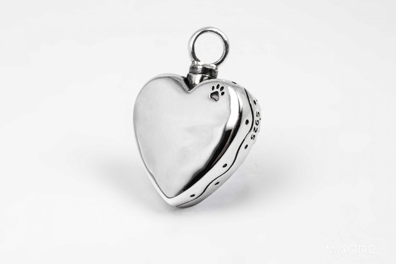 Na horní straně přívěsku je umístěn závitový otvor umožňující bezpečné uložení malého množství popela, srsti, písku, usušených květin nebo jiného drobného materiálu, jenž vám bude připomínat vašeho čtyřnohého přítele. Tento prostor je pečlivě uzavřen šroubkem se závitem vyrobeným z chirurgické oceli. Očko na šroubku, kterým je provlečen řetízek, je ze stříbra, aby designově doplňovalo celý přívěsek.