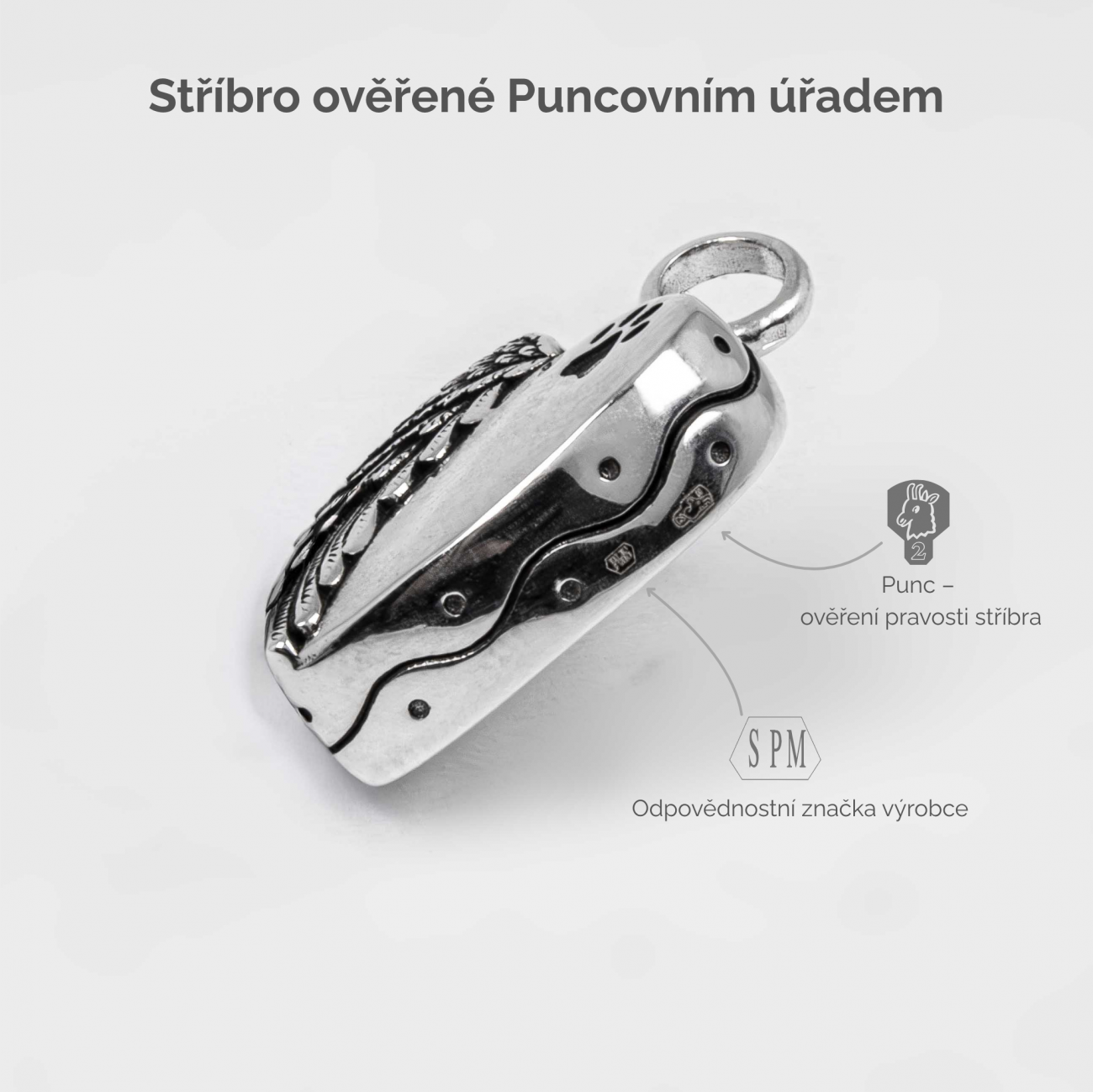 Přívěsek má rozměry 17,8 mm na šířku a 25,1 mm na výšku, s váhou 5,8 g. Řetízek je dlouhý 45 cm a váží 1,75 g. Přívěsek je ověřen a opuncován puncovním úřadem ČR, což zaručuje pravost použitého stříbra. Tento přívěsek je více než jen módní doplněk – je to tichý strážce vzpomínek, který budete mít stále blízko svého srdce.
