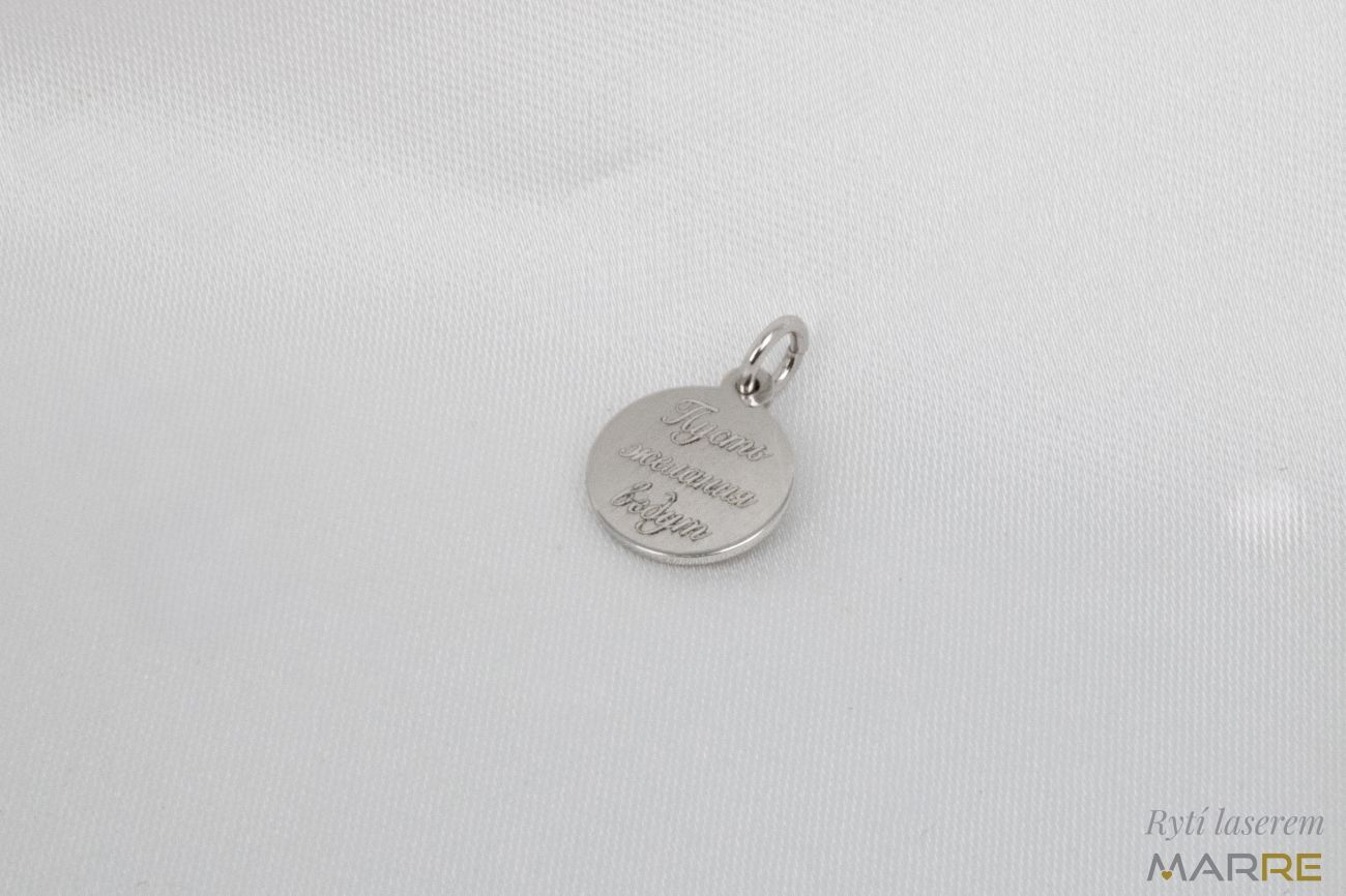 Přívěsek je určen pro krátké gravírování z důvodu omezeného prostoru (průměr 9 mm, tloušťka 0,8 mm). Větší nebo delší texty se na přívěsek fyzicky nevejdou, proto je nutné volit velmi stručné provedení.