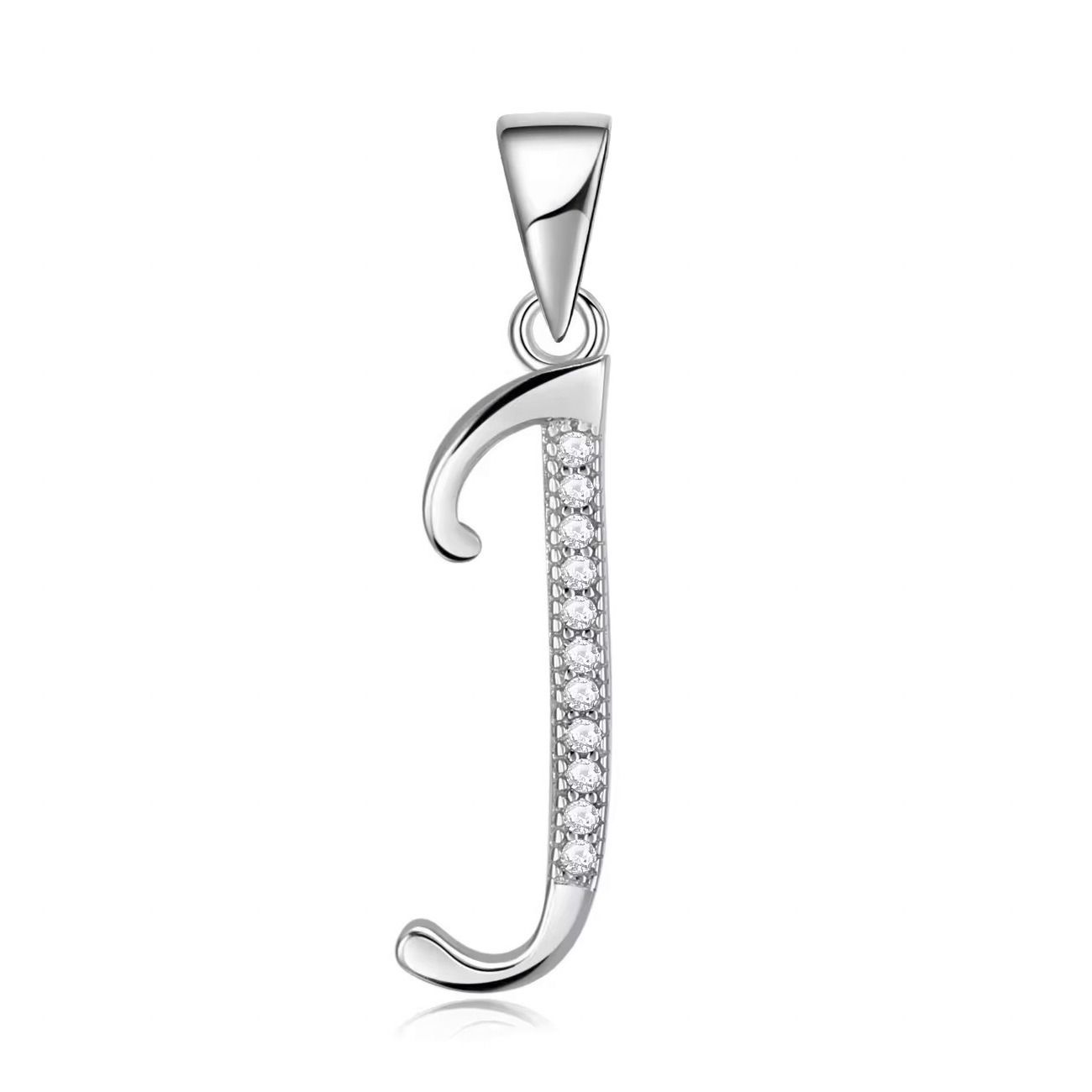 Stříbrný přívěsek ve tvaru iniciály, písmenka J. Písmeno je zdobeno čirými zirkony.