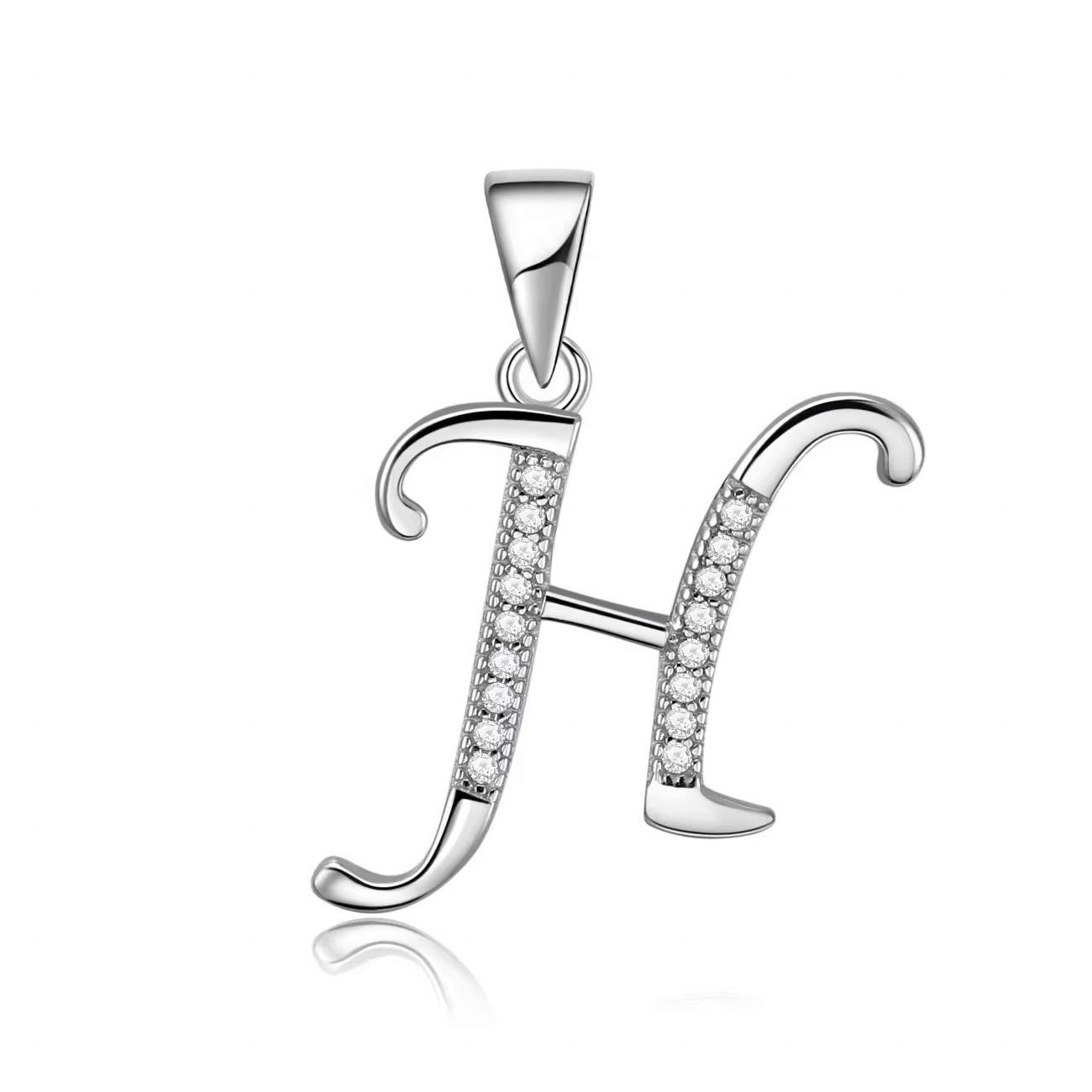 Stříbrný přívěsek ve tvaru iniciály, písmenka R. Písmeno je zdobeno čirými zirkony.