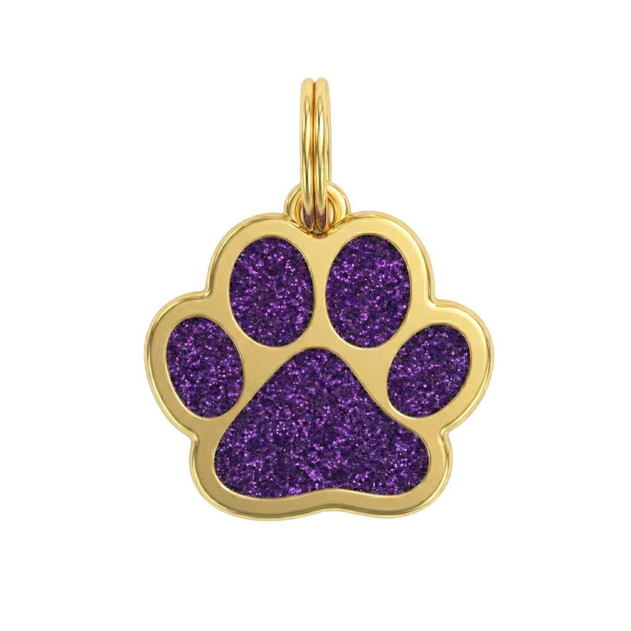 Třpytivá psí známka ve tvaru tlapky se zlatým okrajem je doplněk, který okamžitě zaujme – na slunci se nádherně třpytí a dodá vašemu pejskovi styl, který jen tak někdo nemá.