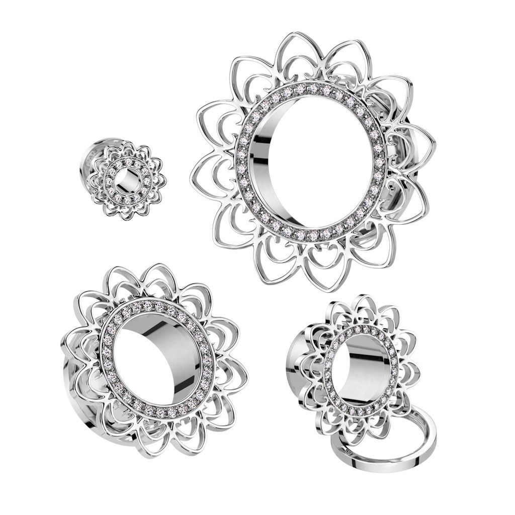 Šroubovací ocelový tunel do ucha zdobený ornamenty a zirkony čiré barvy.