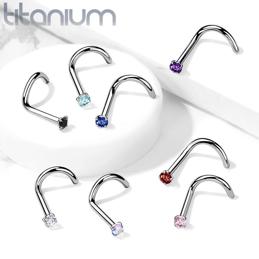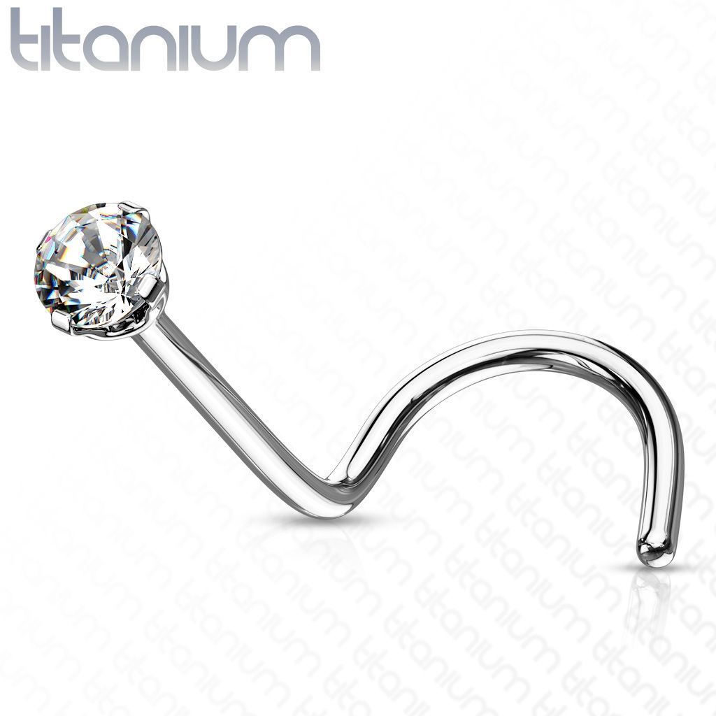 Zahnutý titanový piercing do nosu zdobený zirkonem.