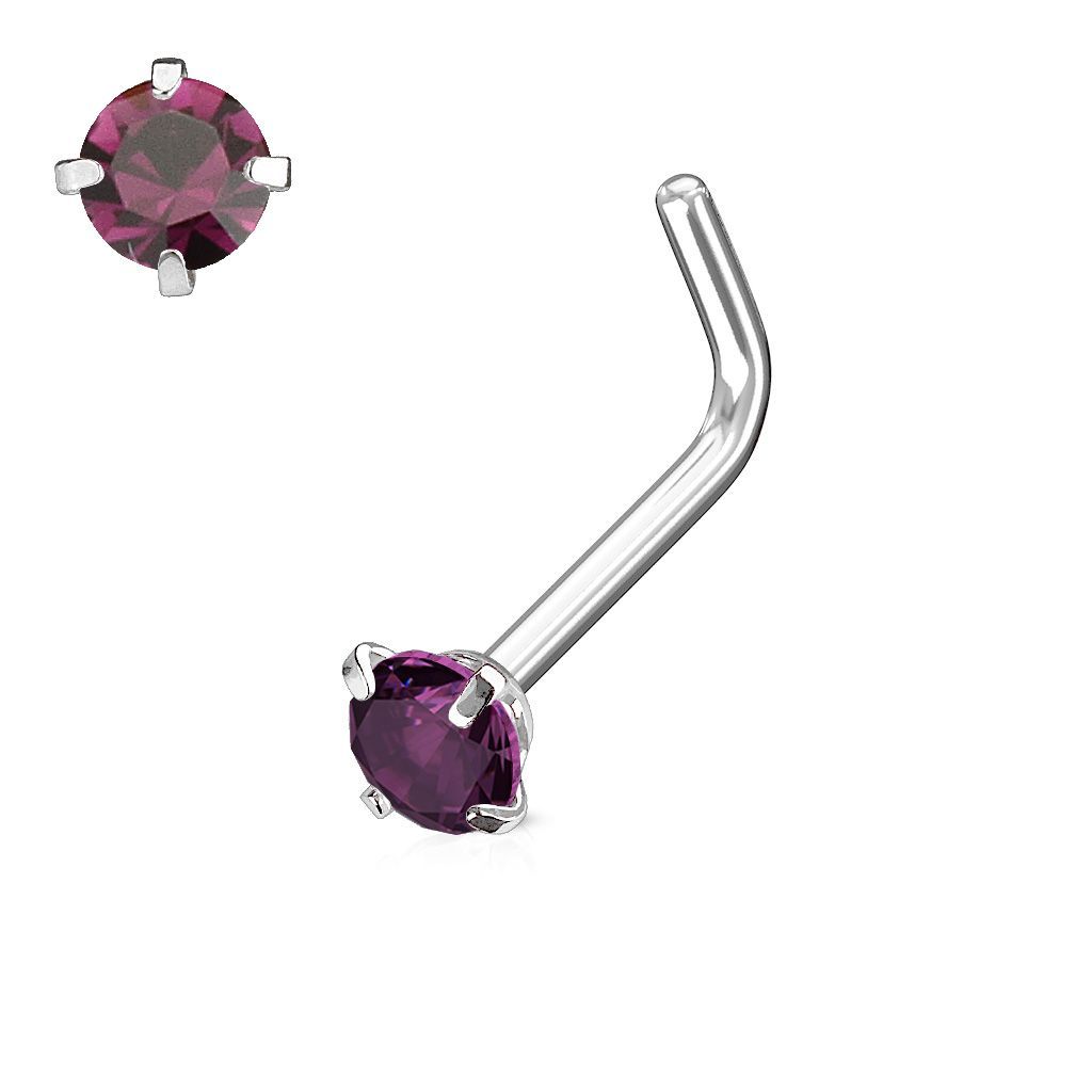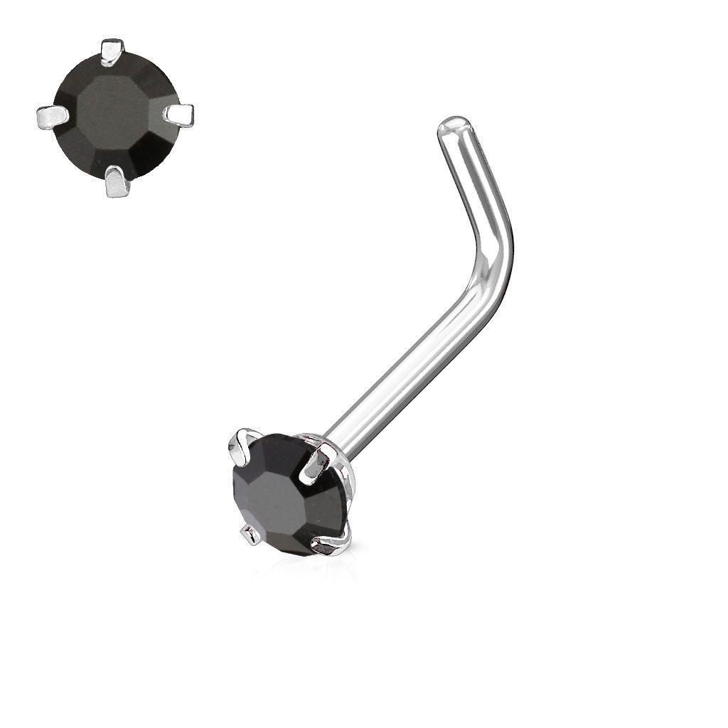 Zahnutý piercing do nosu zdobený kulatým zirkonem o průměru 3 mm.