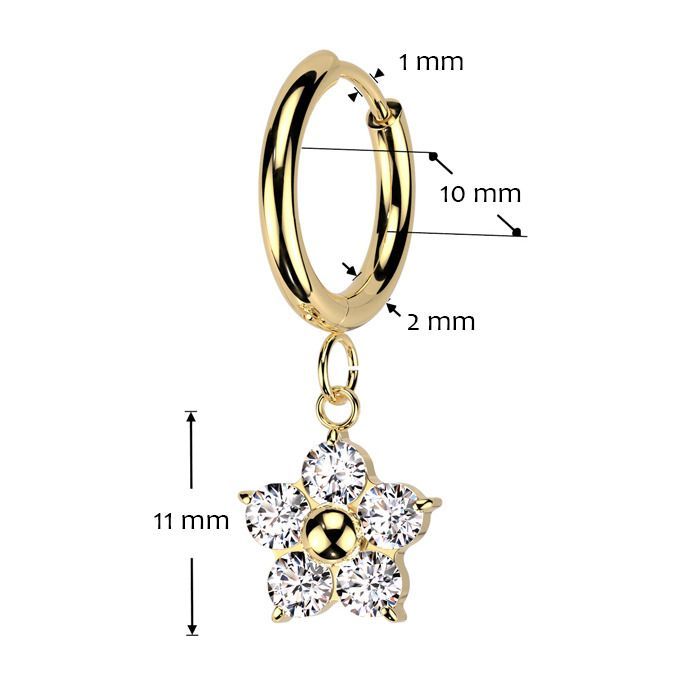 Zlacené ocelové náušnice ve tvaru kroužků zdobených zavěšenou kytičkou, která je osázena čirými zirkony.
