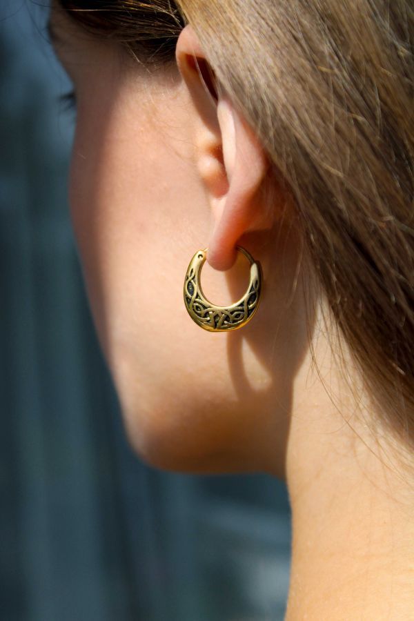 Zajímavé zlacené náušnice z chirurgické oceli - kroužky zdobené ornamenty. Ocelové náušnice v designu starostříbra.