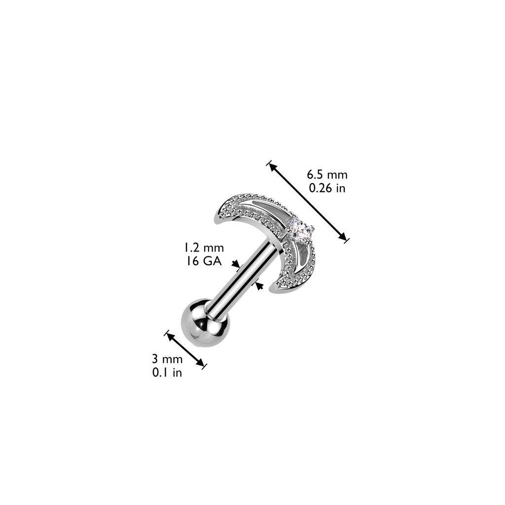 Cartilage piercing do ucha s ozdobou ve tvaru měsíce. Měsíček je zdobený čirým zirkonem.
