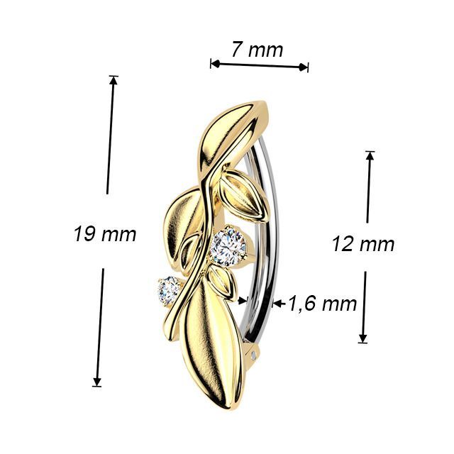 Piercingový šperk určený pro piercing pupíku. S ozdobou lístečků. Lístky jsou zdobeny čirými zirkony.