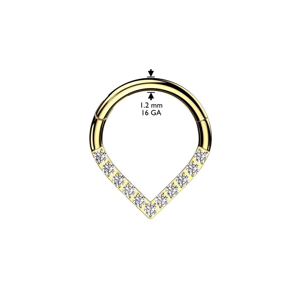 Piercing má praktické otevírání na pantík. Je zdoben tvarováním do V s řadou čirých zirkonů.
