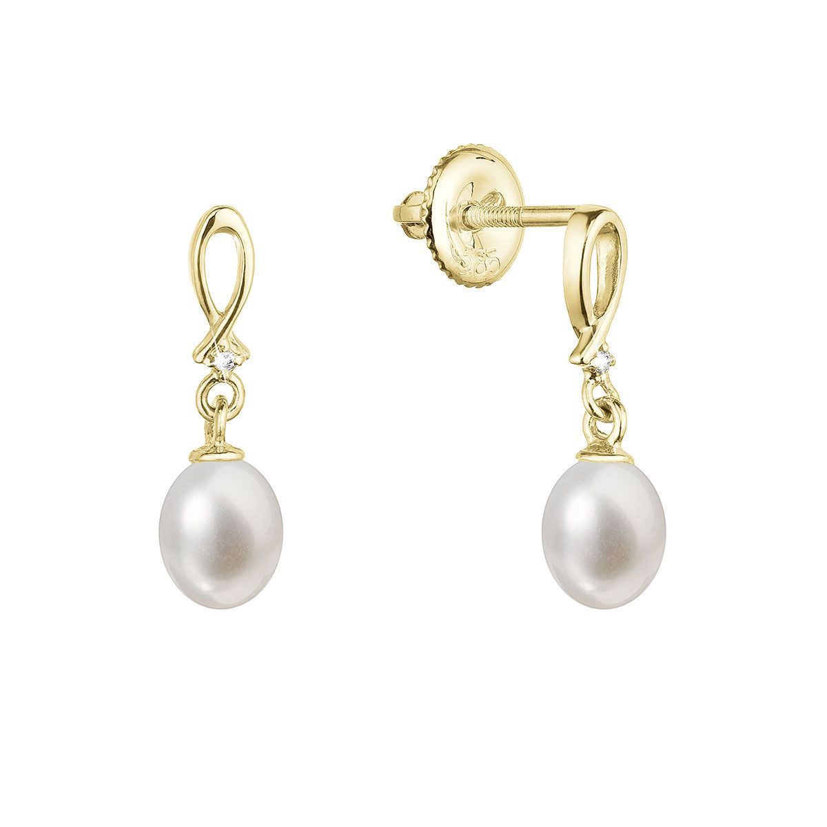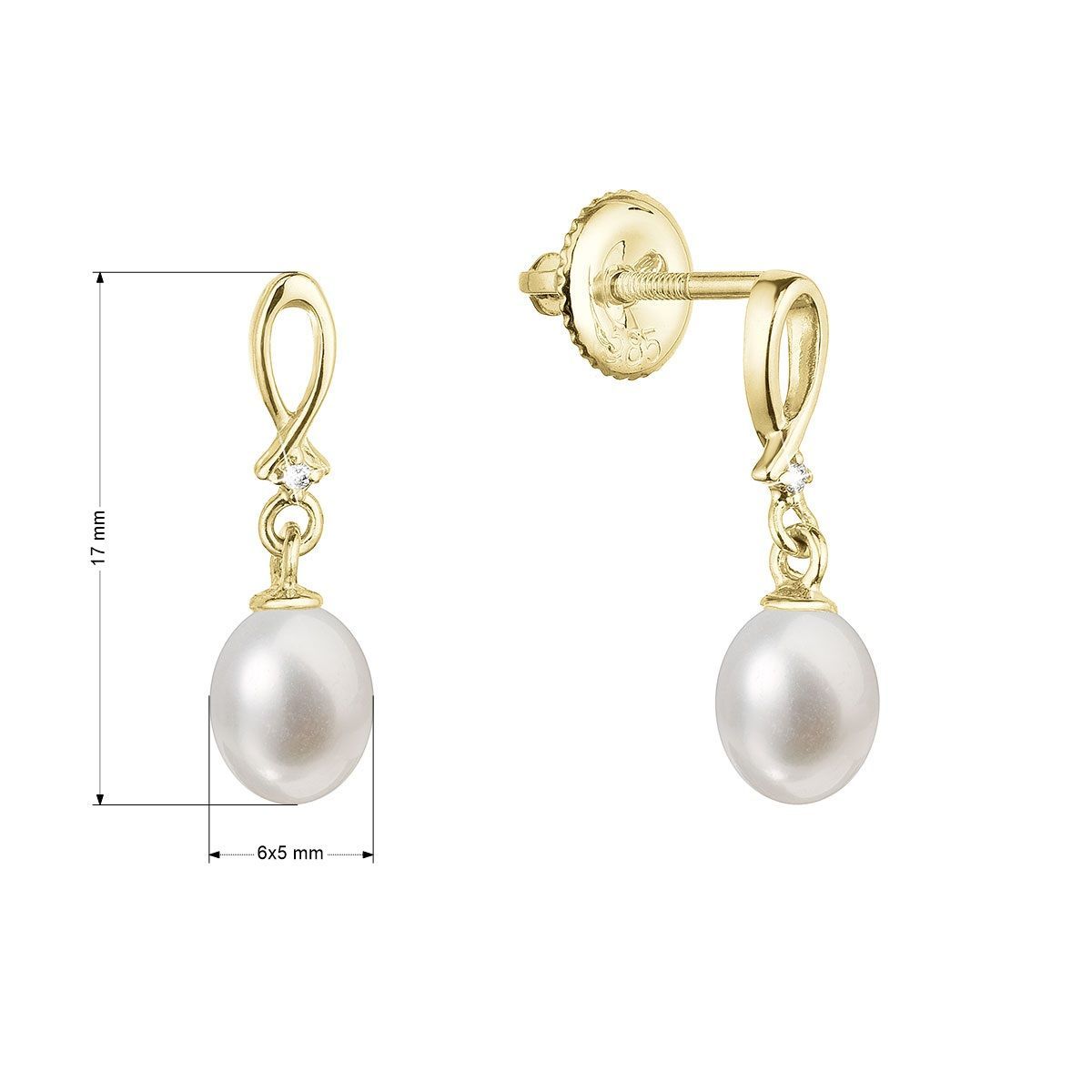Zlaté 14 karátové náušnice visací s říční perlou a brilianty 91PB00039